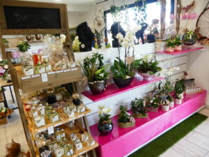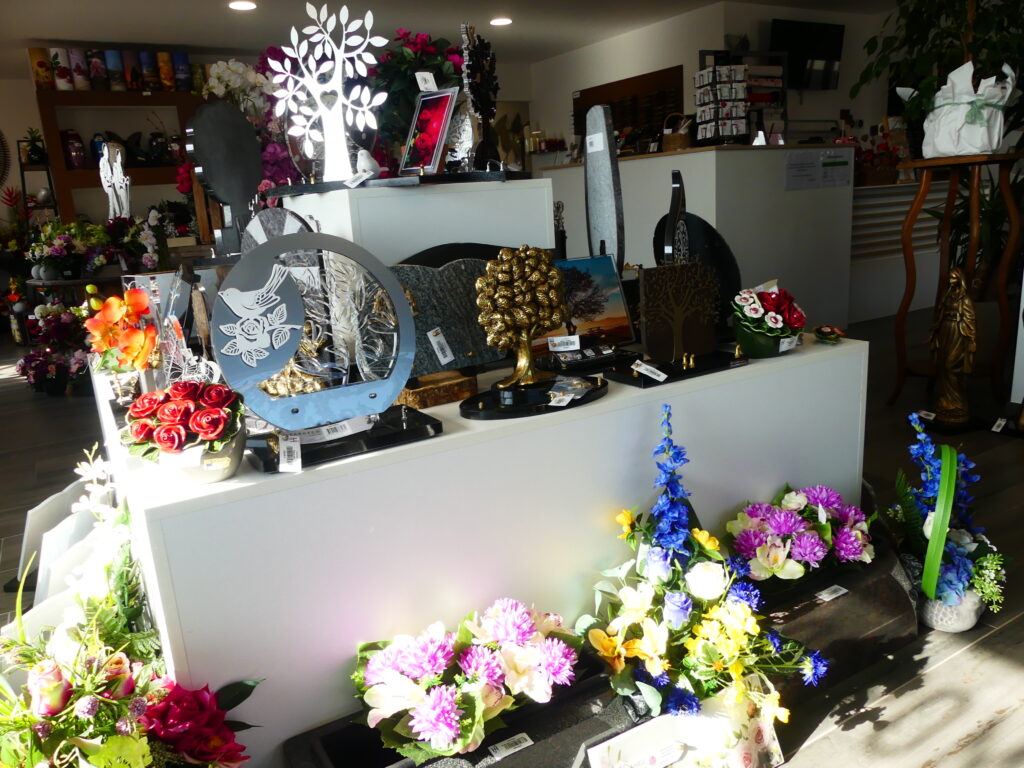 L’agence comprend également un espace de vente proposant un large choix d’articles funéraires : plaques, fleurs artificielles, bronzes et cercueils dans différents types de bois.