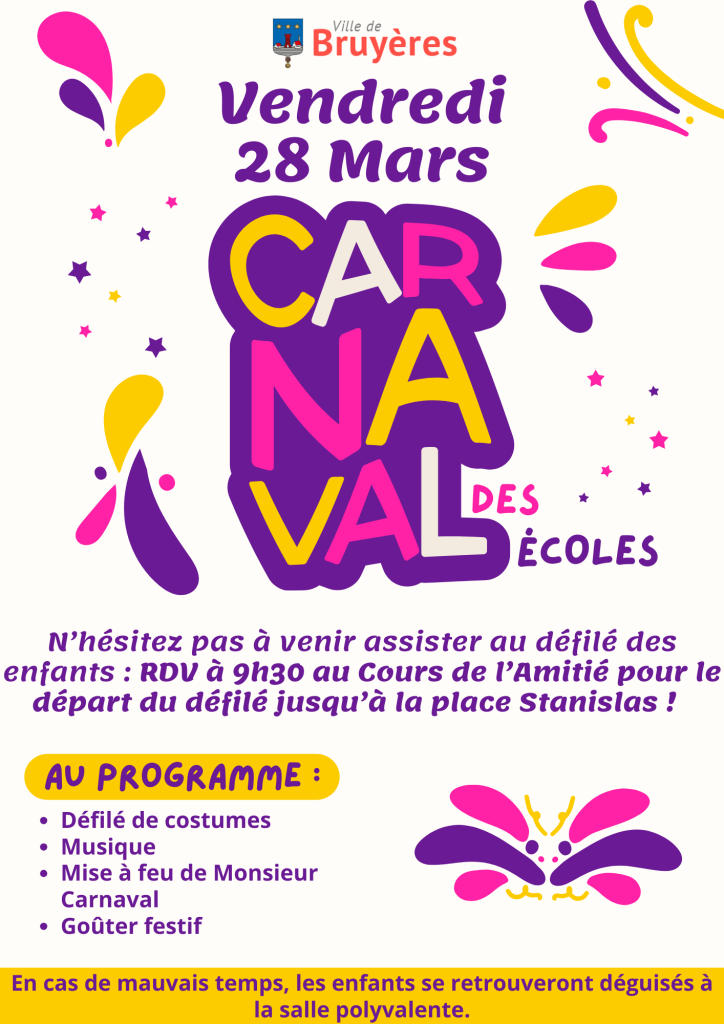 Bruyères – Carnaval des écoles et de la crèche https://vi.si-developpement.fr/epinalinfo/2025/03/bruyeres-carnaval-des-ecoles-et-de-la-creche/ https://vi.si-developpement.fr/epinalinfo/2025/03/bruyeres-carnaval-des-ecoles-et-de-la-creche/#respond Mon, 03 Mar 2025 08:22:31 +0000 https://vosgesinfo.fr/epinalinfo/?p=129073 Le vendredi 28 mars, les enfants des écoles et de la crèche défileront sur l’avenue du Cameroun avec 1 ou 2 chars jusqu’à la place Stanislas où Monsieur Carnaval sera brûlé.