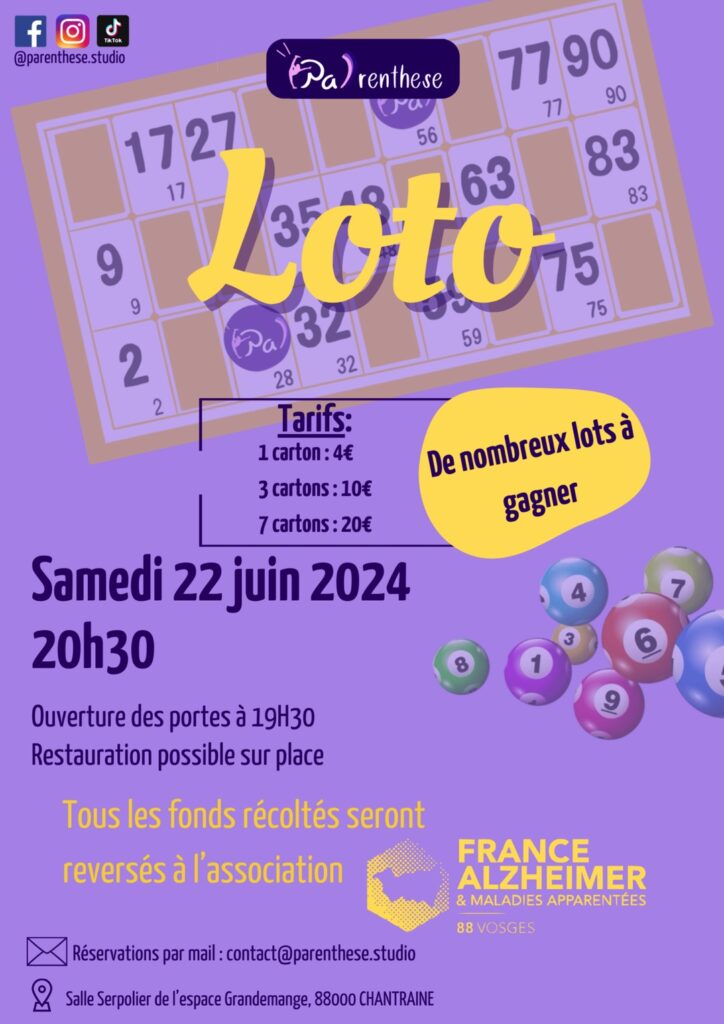 L’école de danse Parenthese organise un loto le samedi 22 juin à 20h30 à Chantraine. Tous fonds seront reversés en totalité à l’association France ALZHEIMER 88.