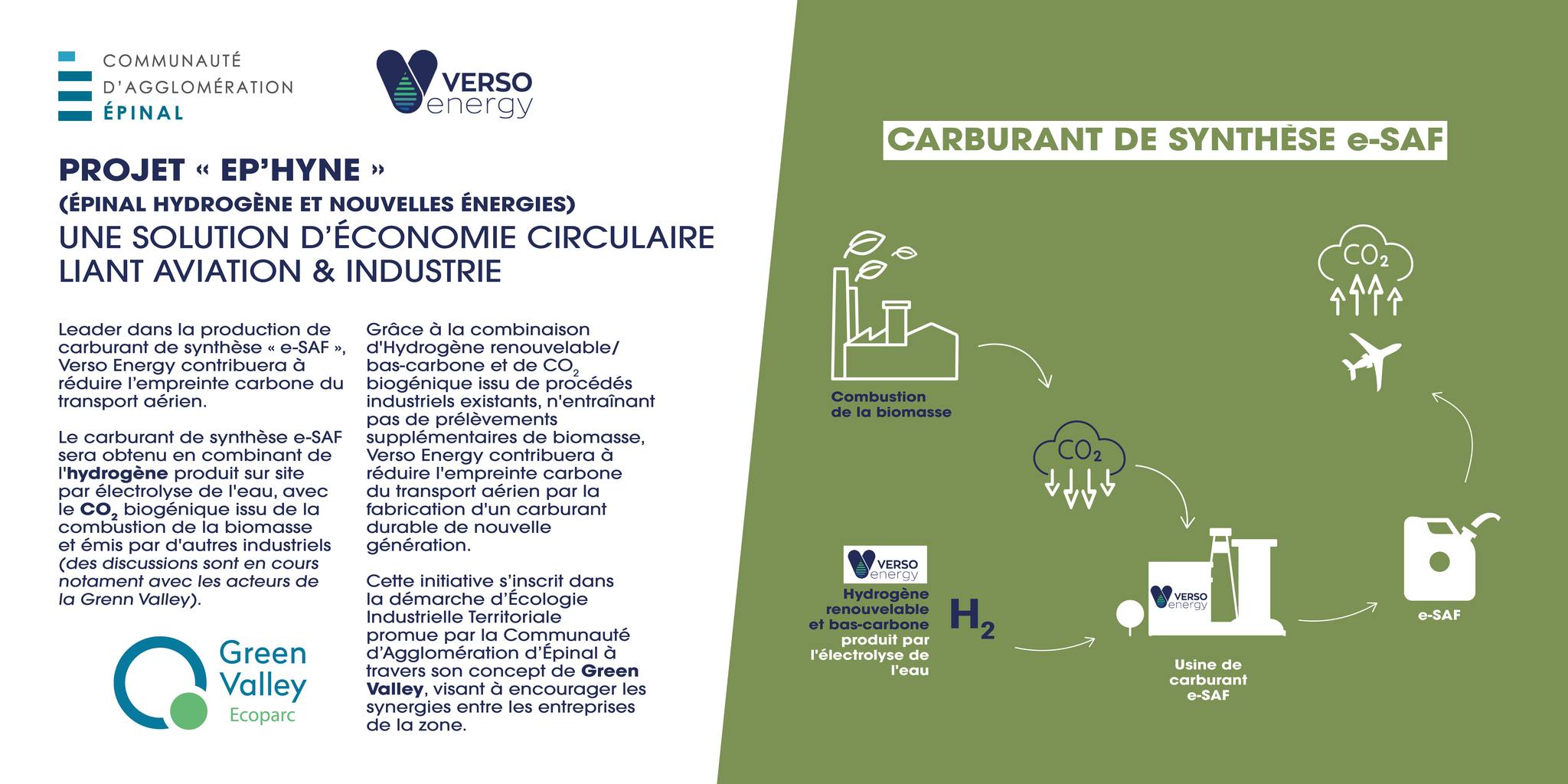 « Nous sommes extrêmement reconnaissants envers la Communauté d’Agglomération d’Épinal pour leur soutien continu et leur vision partagée de l’avenir des énergies renouvelables. La signature de cette promesse de vente marque une étape majeure dans notre engagement à produire un carburant d’aviation durable, qui participera aux objectifs français et européens de décarbonation du secteur de l’aviation. Ce projet illustre notre détermination à innover et à contribuer positivement à la transition énergétique sur l’ensemble du territoire national. » a déclaré Antoine Huard, directeur général et co-fondateur de Verso Energy.