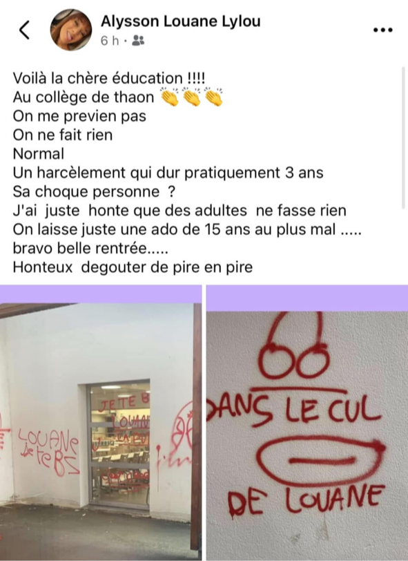 « On ne me prévient pas. On ne fait rien. Normal. Un harcèlement qui dure depuis pratiquement trois ans. Ça ne choque personne ? J’ai juste honte que des adultes ne fassent rien. On laisse juste une ado au plus mal. Bravo. Belle rentrée. Honteux. Dégoutée. De pire en pire. »