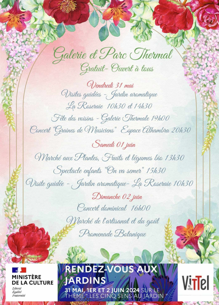 Destination Vittel vous proposera un parcours sensoriel et olfactif : visites encadrées à la découverte de massifs dédiés aux plantes aromatiques, rendez-vous à la Roseraie à 10h30.