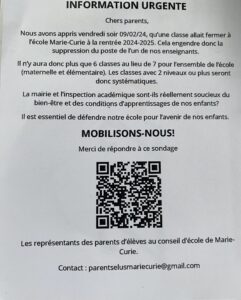 Le collectif des 7 représentants s’insurge et refuse d’accepter de telles mesures. « La mairie et l’inspection académique sont-ils réellement soucieux du bien-être et des conditions d’apprentissages de nos enfants ? » Leur objectif est d’informer et de trouver un moyen de communication avec les parents d’élèves. Ils ont également effectué des démarches pour obtenir un rendez-vous à la mairie, ils attendent des réponses : « Il est essentiel de défendre notre école pour l’avenir de nos enfants ». Les représentants des parents d’élèves sont déterminés et « veulent taper fort » assurait leur porte-parole « tous les moyens sont bons ».
