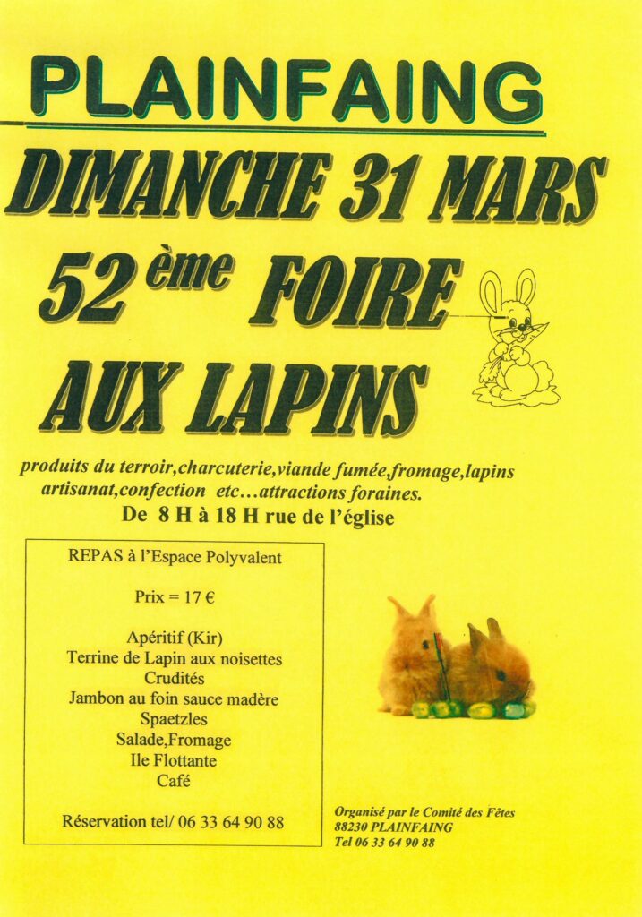 La 52 foire aux lapins de Plainfaing, organisée par la Comité des Fêtes, se tiendra le dimanche 31 mars prochain, de 8h à 18h rue de l’Eglise. Sur place, les visiteurs pourront retrouver des produits du territoire, charcuterie, viande fumée, fromage, lapins, artisanat, confection, etc. ainsi que des attractions foraines. Le midi, un repas sera partagé à l’espace polyvalent de la commune. Plus d’informations à ce propos sur l’affiche ci-dessous.
