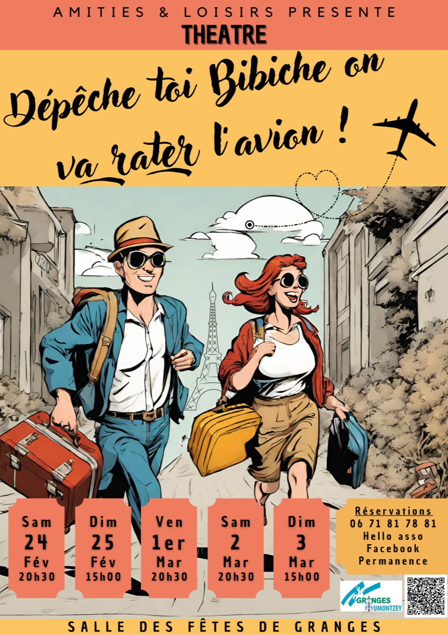 La troupe Amitiés et Loisirs de Granges Aumontzey a le plaisir de vous présenter sa nouvelle pièce écrite par Jérôme Dubois « Dépeche toi Bibiche on va rater l’avion ! » .