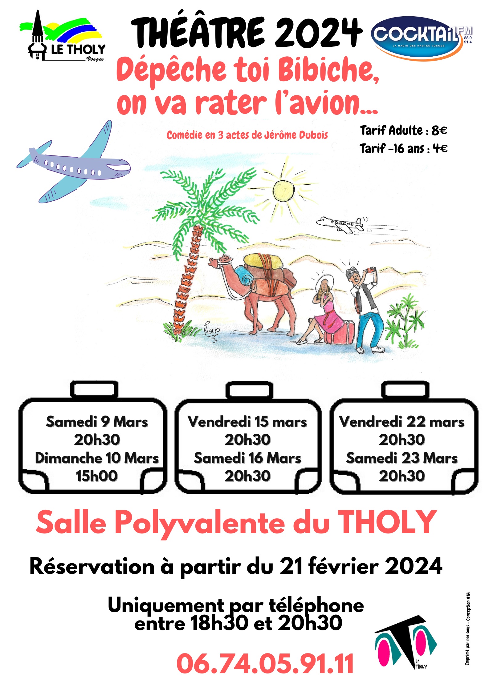 La Troupe de théâtre de l’ATA du Tholy se prépare pour vous distraire avec leur nouvelle pièce « Dépêche toi Bibiche, on va rater l’avion » de Jérôme Dubois. Marc et Sophie terminent leur valise pour partir au Maroc mais c’est sans compter sur Rosa, la concierge et quelques déboires qui vont retarder leur départ…
