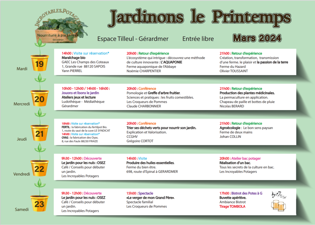 Comme annoncer lors de la dernière assemblée générale de l’association, les Incroyables Potagers organiseront leur toute première fête printanière baptisée « JARDINONS LE PRINTEMPS », un événement qui célèbre la beauté de la saison et l’art du jardinage.