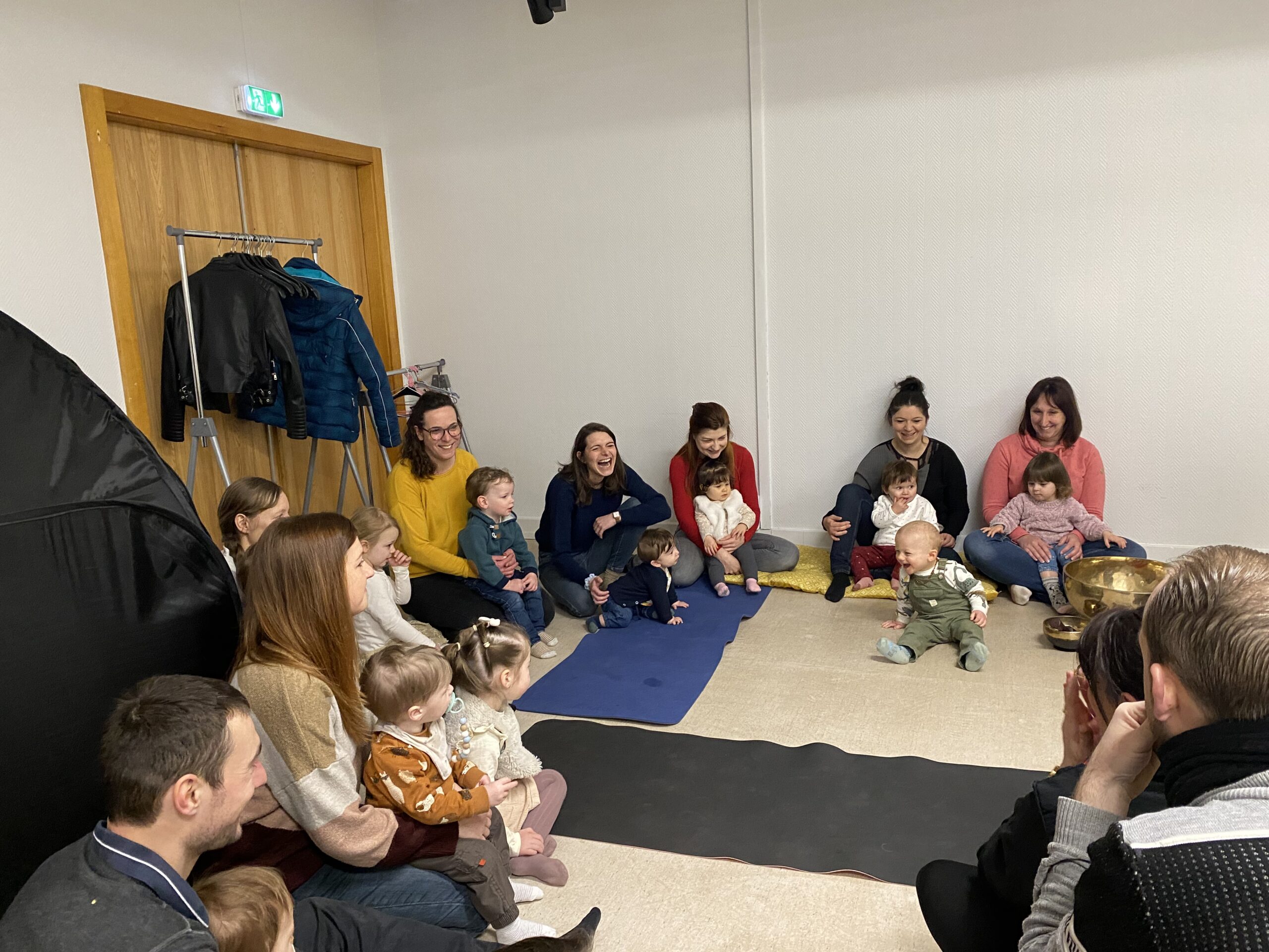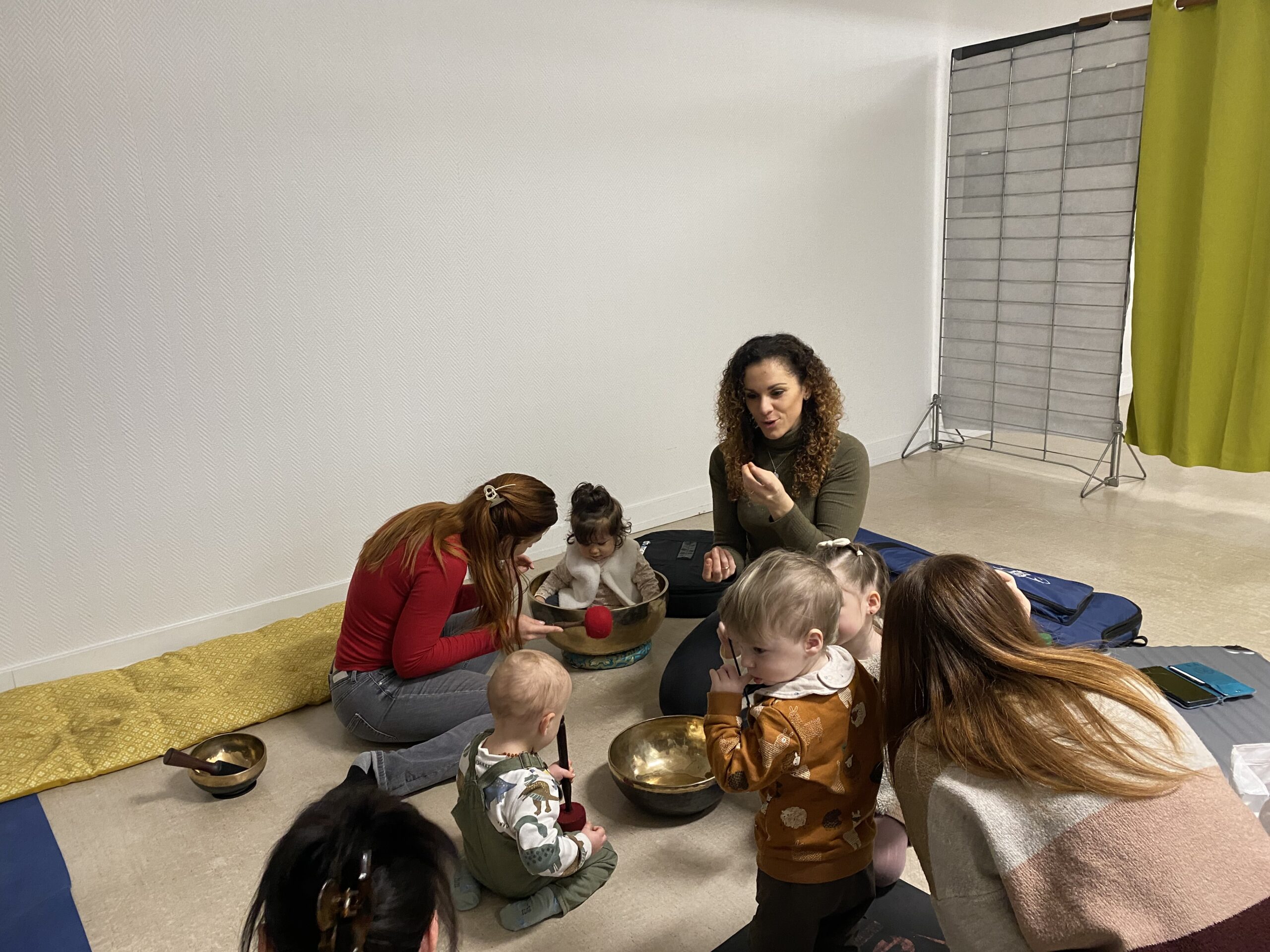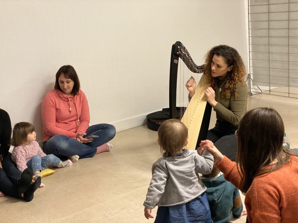 12 adultes et 12 enfants ont participé aux 2 ateliers proposés ce matin par l’animatrice Mélissa Serfague des Ateliers du Bien-Naître : un espace sonothéraphie avec tambours, bols tibétains et autres instruments de percussion que les enfants ont pu tester selon leur envie, invitant les parents à les suivre. Un coin relaxation avec des tapis et des pop-up pour aider à la concentration et à canaliser les énergies. Les enfants étaient libres d’évoluer vers l’un et l’autre où ils ont fait la découverte de sons, de résonance, de sensations. Cette heure partagée a été une parenthèse de bien-être et de détente pour tous. L’animatrice, fraîchement formée à la harpe, a terminé la séance par une démonstration, interprétant 2 morceaux qu’elle a accompagné en chantant, ce qui a ravi petits et grands. Ces ateliers permettent au jeune enfant de choisir une activité qui lui correspond, qui a du sens dans son développement. Les enfants ne recherchent pas tous la même chose au même moment.