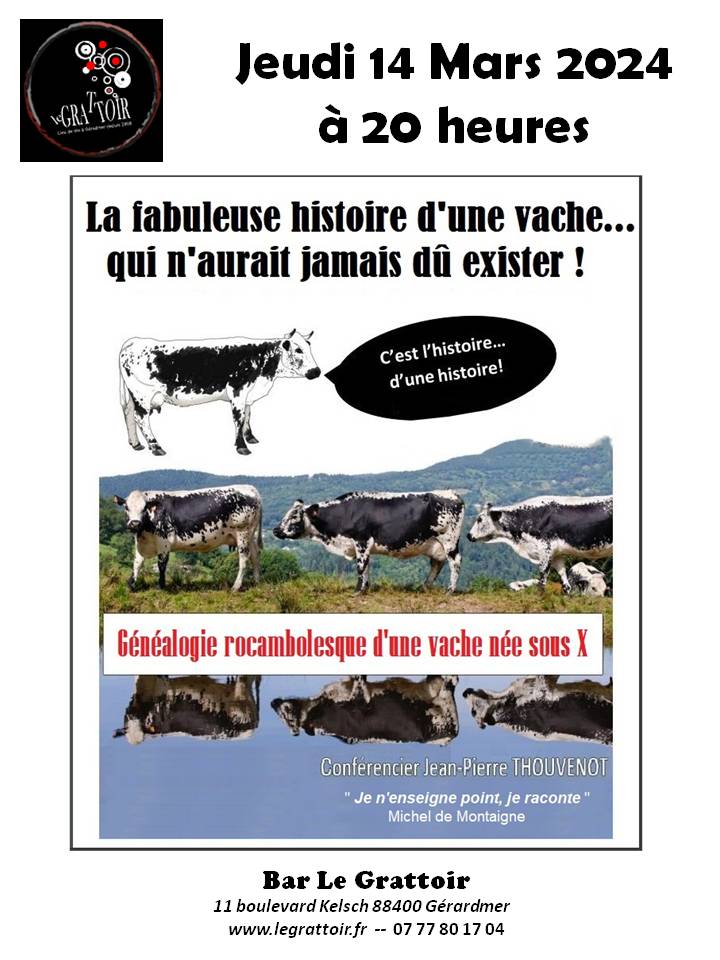 Conférence animée par Jean-Pierre ThouvenotNotre Vosgienne est née d’un concours de circonstances incroyables, aux rebondissements dignes d’un roman d’aventures. De fait, remonter le fil de son histoire ressemble plus à une enquête policière qu’à une recherche sur la génétique ou la production laitière.Il s’agit de « l’histoire de l’histoire » d’une brave bête dont l’existence n’a tenu qu’à un fil… et qui ne doit pratiquement rien aux Vosges, voire aux Vosgiens !Sa création n’a tenu qu’à un détail dont l’histoire a le secret et les curieux qui feront l’effort de venir à cette conférence, repartiront avec des savoirs auxquels ils ne s’attendent absolument pas.Les absents auront tort et les curieux s’endormiront moins « bêtes ».