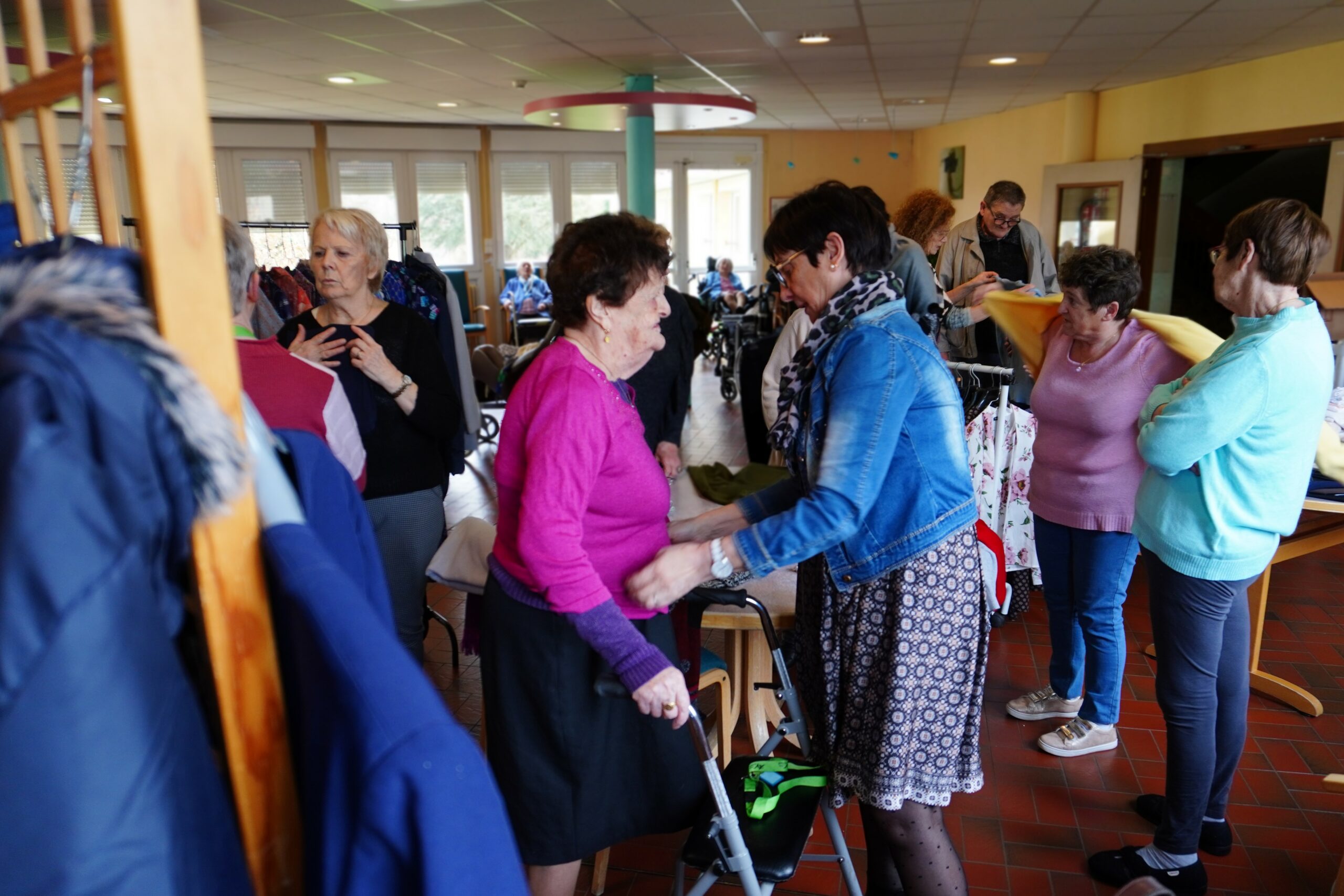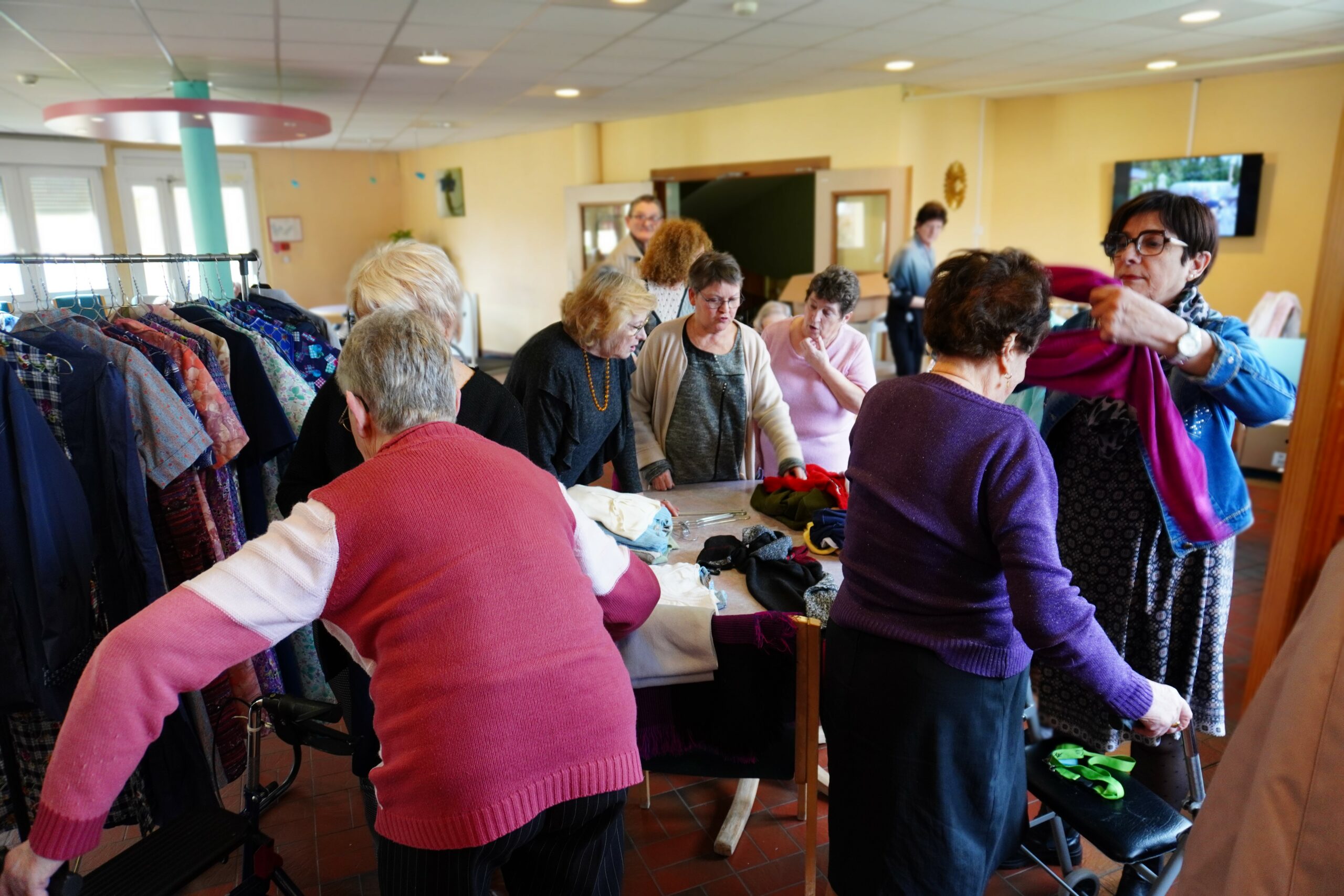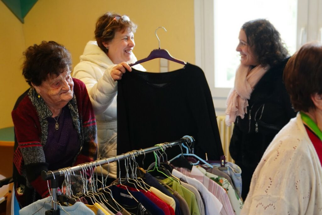 Cette initiative visait principalement les femmes, plus nombreuses et souvent désireuses de renouveler leur garde-robe. Les bénévoles de l’association Résolfa avaient soigneusement sélectionné les vêtements en amont. Une variété de tailles et de couleurs a été choisie par l’équipe afin de satisfaire un maximum de goûts parmi les résidentes. Gilets, pulls, pantalons, vestes, mais aussi sous-vêtements, collants et chemises de nuit, étaient organisés comme dans une véritable boutique. Ils ont été mis gratuitement à la disposition des résidentes et sans limite de choix. Après avoir essayé les vêtements, ils ont été étiquetés puis dirigés vers la lingerie de l’établissement pour être restitués en parfait état à leurs nouvelles propriétaires, ravies.