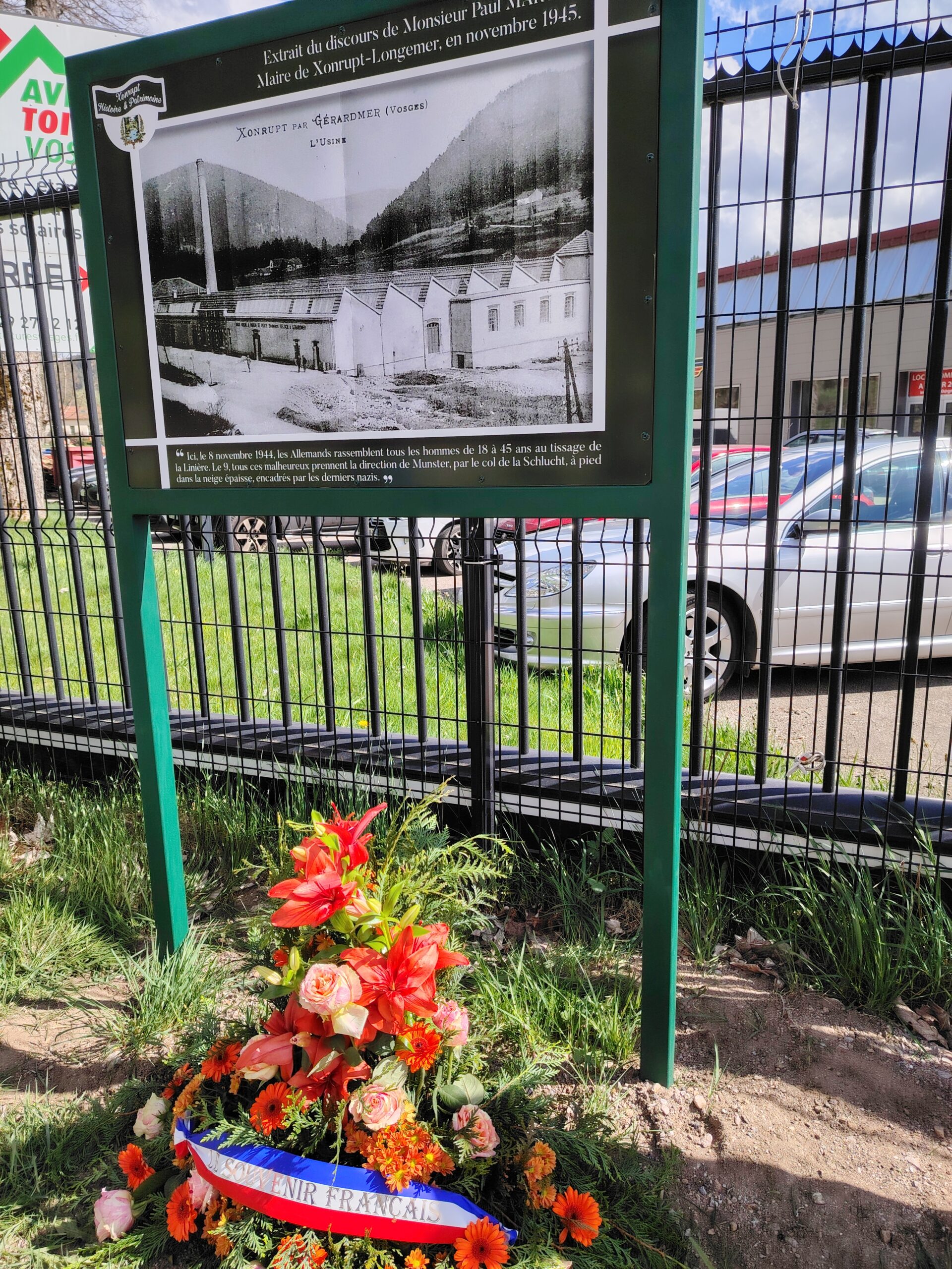 Une opération qui fait suite à un travail de l’école des 2 lacs de Xonrupt et plus précisément des élèves de CM1-CM2 de Valérie Surel, dans le cadre du programme scolaire annuel sur la Seconde Guerre mondiale. Travail qui a été effectué en partenariat avec l’association Xonrupt Histoire et Patrimoine qui a financé la plaque en question qui représente notamment l’usine telle qu’elle était à l’époque, le tout accompagné d’un petit texte explicatif. Situé route de Colmar, le bâtiment appartient actuellement à M. Harras qui a été remercié pour avoir accepté que cette plaque commémorative soit installée par les services de la commune.