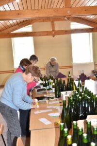 Il était temps pour l’association La Fougère de mettre en bouteille sa fameuse lessive obtenue à base des cendres de fougères. Les fougères ont été brûlées en automne puis leurs cendres récoltées il y a quelques semaines, mises en eau et décantées. Les bénévoles ont ensuite récupéré les bouteilles chez les particuliers ou restaurateurs et les ont nettoyées avant de les remplir, les boucher et les étiqueter. C’est au total près de 700 bouteilles qu’ils ont garnies de cette lessive nature ou au serpolet et qu’ils vont mettre en vente au prix de 5€. La secrétaire de l’association annonce déjà de nombreuses commandes. Un torchon offert par les Ets Doridant y sera ajouté. Sa réputation n’est plus à faire confirme Jean-Louis Croville « notre lessive possède un remarquable pouvoir grâce à sa haute teneur en potasse. Une fois diluée, elle est mise en machine, ou encore lave les sols car dégraisse bien ». Leur action terminée, les bénévoles se sont retrouvés autour d’un repas pour clôturer cette journée conviviale.