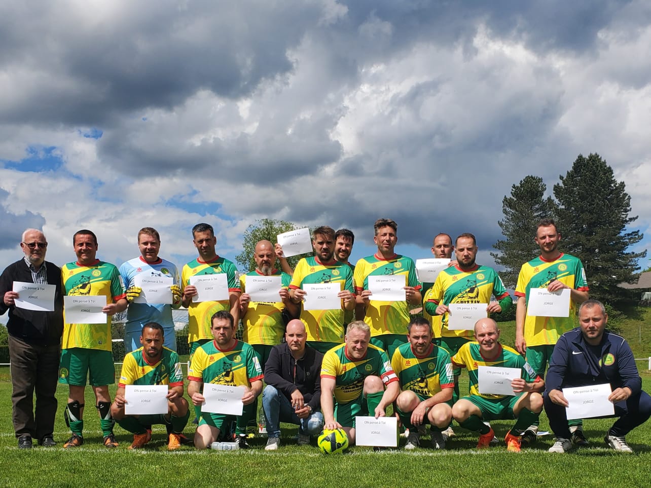 « Samedi dernier, notre équipe vétéran s’est produite à ARCHES dans des conditions bien particulières ; en effet nonobstant le fait que c’est le titre de Champion qui se jouait alors, notre coéquipier Jorge se trouvait entre la vie et la mort après avoir été victime d’un infarctus à l’entraînement jeudi dernier. Inutile de dire que tous nos joueurs étaient mentalement auprès de leur ami et déterminés à lui offrir un succès.