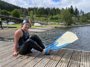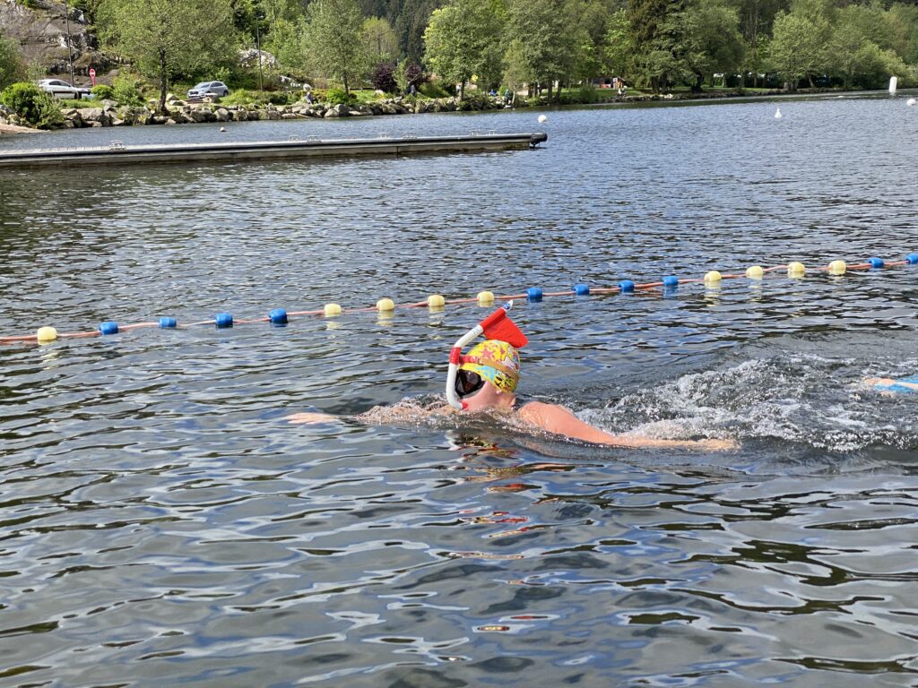 Les clubs de Sélestat, Montbéliard, Reims, Uckange et Gérardmer étaient représentés. A 10 h les nageurs du 3000m et 5000m se sont élancés dans l’eau, en mono ou bi palmes et à 10 h 15 c’était au tour des candidats du 1000m et 2 benjamines Gérômoises y ont pris part. Le 3000m a eu la faveur des masters féminines locales. Parmi les inscrits du jour, certains évoluent déjà à un bon niveau et la première Séniore du 1000m, Noémie Da Silva, était en équipe de France en 2023 et elle a participé aux championnats du monde en Serbie. Elle vient du club de Uckange Evolution et nage en monopalme. C’est une technique de nage plus rapide mais aussi plus exigeante physiquement. Elle s’entraîne tous les jours en piscine ou au lac de Remerschen au Luxembourg.