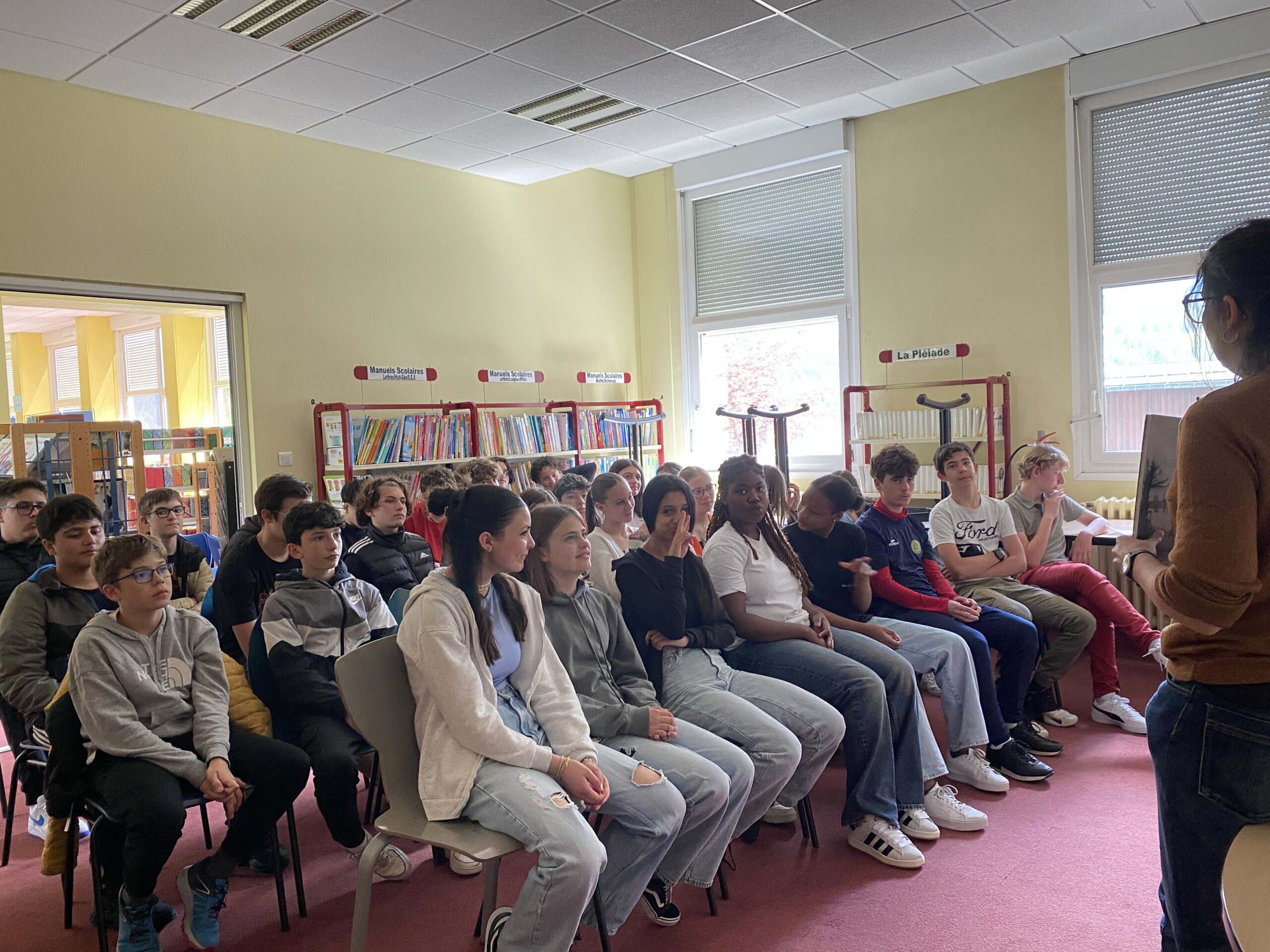 Ce lundi 13 mai les élèves de 4e1 avaient rendez-vous au CDI de la Haie Griselle avec leur professeure de français Nathalie Picot pour accueillir Véropée alias Véronique Pot, autrice et illustratrice de bandes dessinées.