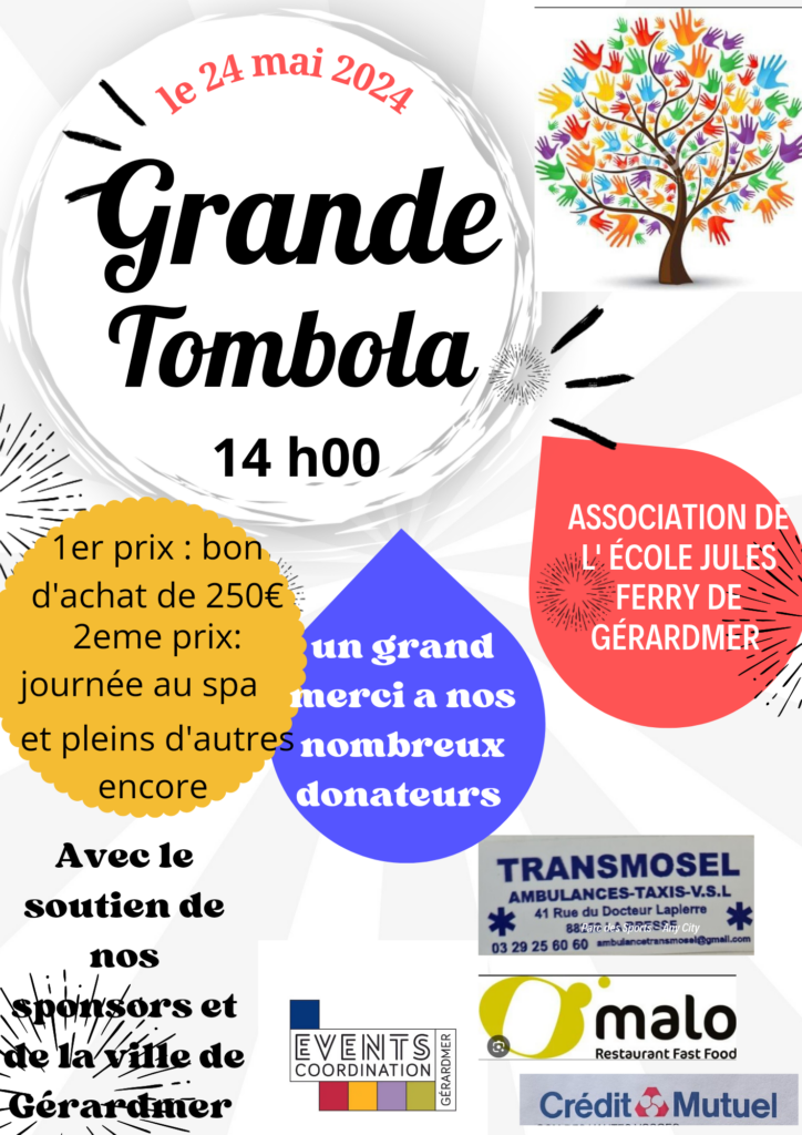 L’association de l’école Jules ferry organise le tirage de la tombola dont les bénéfices serviront à offrir une sortie de fin d’année aux élèves de l’école. Rendez-vous à 14h00 le 24 mai avec de très nombreux lots (Le premier lot étant un bon d’achat de 250 €, le second une entrée au spa pour 2 personnes, des cours de ski,des repas au restaurant, des bons de réduction, bons d’achat etc. pour un total de 126 lots).