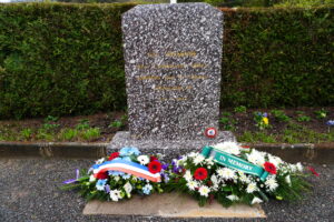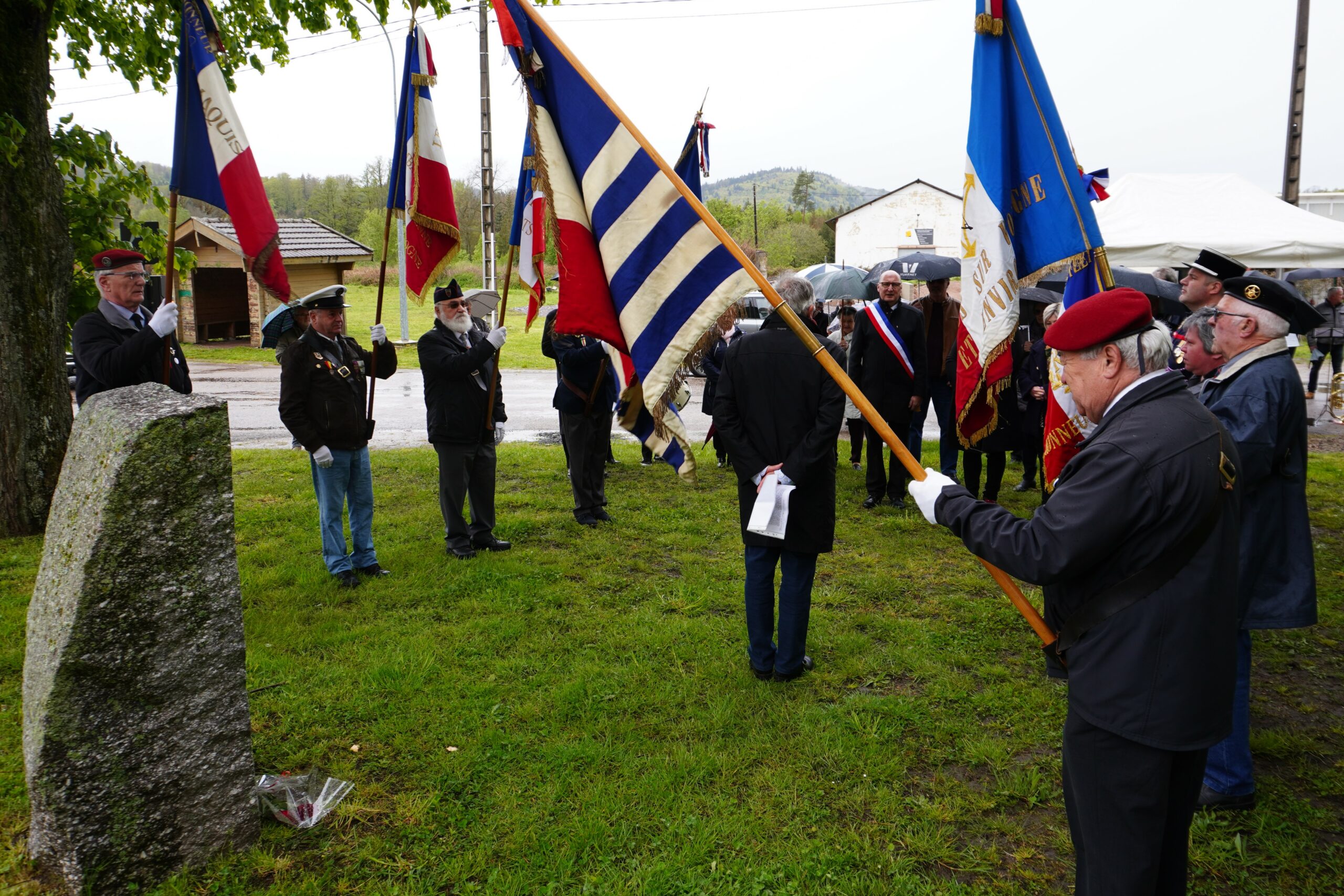 Le cortège s’est ensuite rendu à la stèle Yvan Homel à Aumontzey, en présence des descendants Homel (son fils, Jacky et sa fille, Christine) et de Régine Jacquemin, Présidente de l’Association du Souvenir des Événements du Maquis de Corcieux. Jacky Homel a lu le discours tiré de la fiche biographique de son père, écrite à la demande de l’amicale nationale Natzweiller-Struthof. Yvan Homel était un résistant. Arrêté le 15 juin 1944 par la Gestapo, il est déporté de camps en camps (Struthof, Dachau, Haslach, Vaihingen). Le 7 avril 1945, les troupes du Général de Monsabert, de la 1ère armée Française, composées du 4ème régiment des tirailleurs Tunisiens pénètrent dans le camp. Yvan Homel est ensuite évacué. Ancien Maire d’Aumontzey, il décédera le 3 février 2010 à St-Dié-des-Vosges, il aurait fêté ses 100 ans cette année. Le récit poignant de son parcours sera disponible dans votre prochain Vologne Infos, dans la rubrique Histoire.