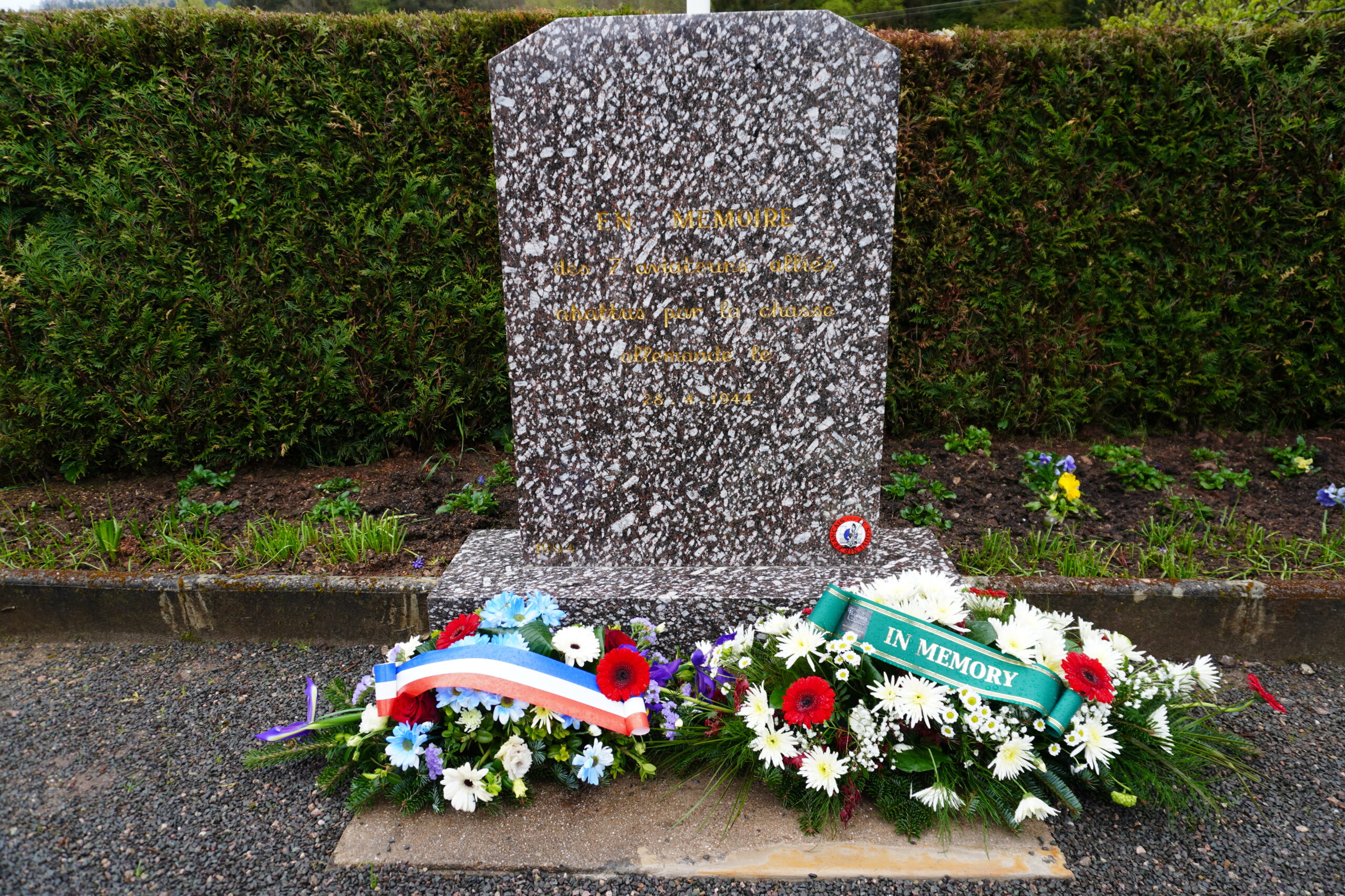 Après le dépôt de deux gerbes, la cérémonie a été marquée par le dévoilement d’une nouvelle plaque commémorative en présence d’Élisabeth Klipfel-Dott, Conseillère Départementale, élus adjoints et conseillers, Maurice Lemarquis en sa qualité de maître de cérémonie, Bernard Lazatti président de l’association des anciens combattants d’A.F.N. accompagné de plusieurs membres, de portes drapeaux et d’habitants. Cette plaque, intitulée « Hommage aux aviateurs du Lancaster ND8253 », est faite en mémoire de sept aviateurs : cinq Anglais, un Australien et un Canadien, morts au combat près des Evelines. Leur enterrement a eu lieu le 29 avril 1944 et ils reposent au cimetière de Granges-sur-Vologne. L’idée est née d’un membre de la famille des aviateurs, et la famille Rowley a pris en charge le coût de fabrication de cette plaque.