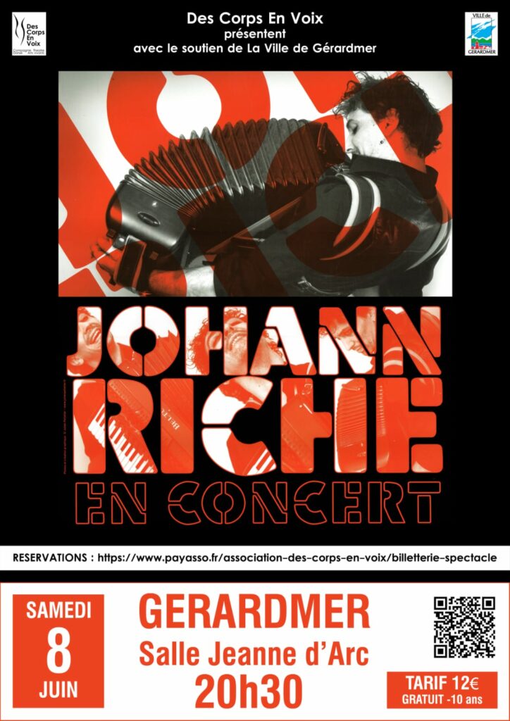 Le 8 juin 2024, à 20h30, à la salle Jeanne d’Arc de Gérardmer (11 rue Carnot), la compagnie Des Corps en Voix accueillera l’accordéoniste Johann Riche pour un concert solo. Vosgien d’origine, ce musicien a réussi à faire sa place dans le paysage musical français. Aujourd’hui, il accompagne notamment Jacques Higelin, Damien Saez ou encore Miossec.