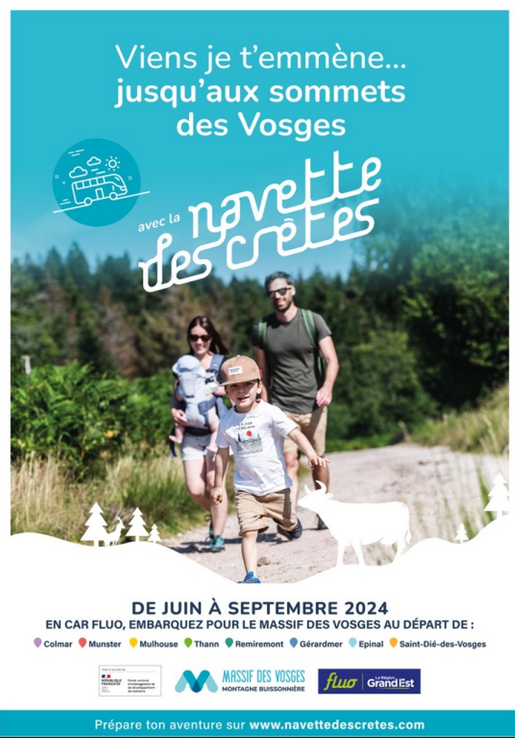 Embarquez pour une aventure écologique et économique à travers les sommets des Vosges avec la Navette des Crêtes ! Depuis 2001, la Navette des Crêtes1, financée par la Région Grand Est et intégrée au réseau Fluo, reprend du service pour un été sobre en carbone. La Navette sillonnera le massif vosgien des plaines aux sommets pendant les week-ends de juin à septembre tous les jours durant tout l’été du 1er juillet au 31 août 2024, de 8h30 à 18h30.