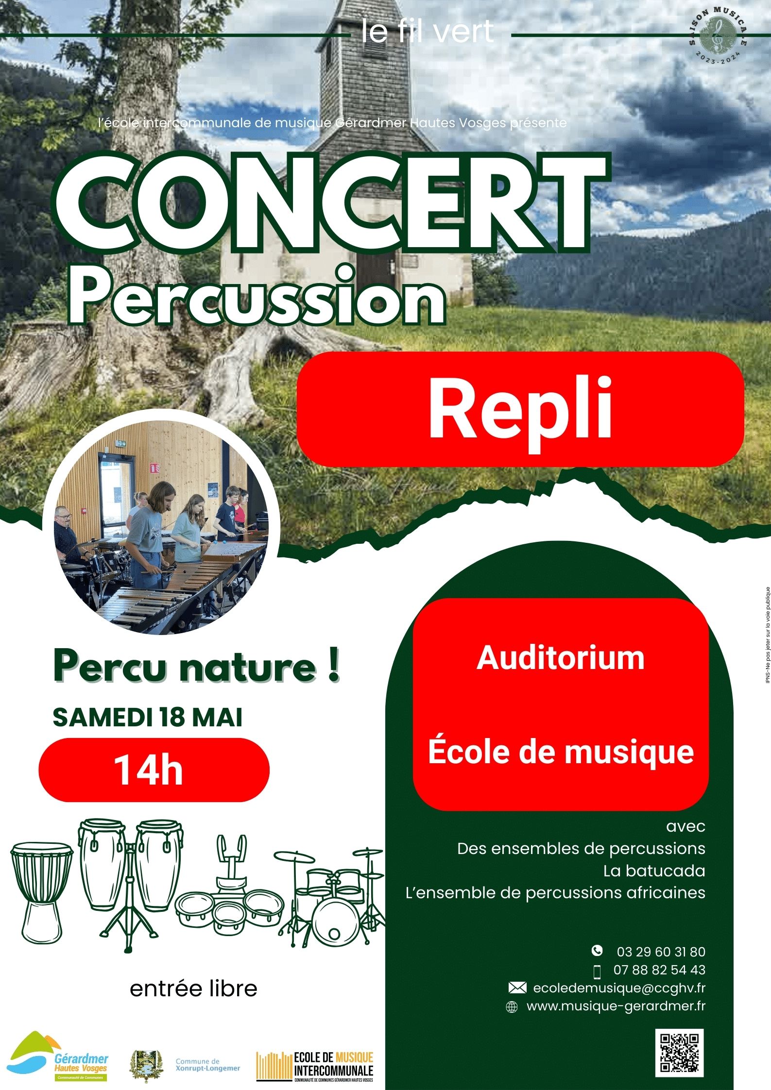 En raison du mauvais temps, le concert de percussions initialement prévu au bord du lac de Longemer aura lieu à l’auditorium de l’école de musique intercommunale.