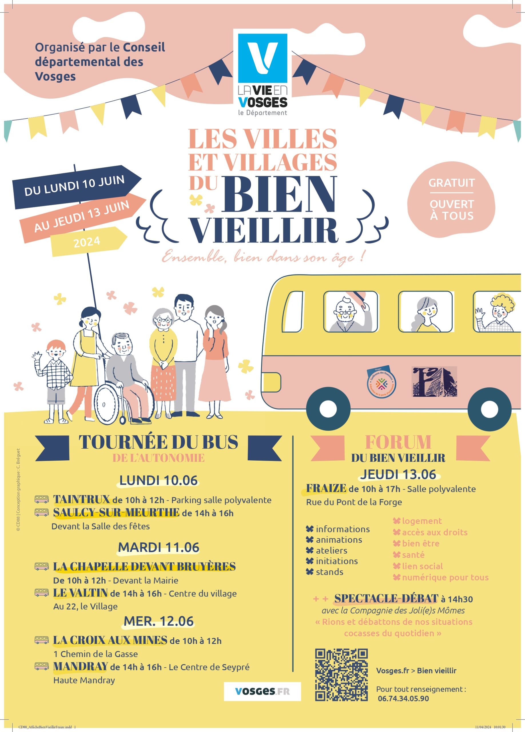 Organisée par le conseil départemental des Vosges, la tournée du bus de l’autonomie s’arrêtera le mardi 11 juin 2024 de 14h à 16 h, au centre du village du Valtin. Ce bus est aménagé comme un logement, il permet d’aborder toutes les aides techniques facilitant le bien vieillir à domicile et de donner une information générale sur les dispositifs de soutien du département : CLIC, APA, soutien aux aidants… Venez nombreux découvrir des solutions simples pour rester chez soi le plus longtemps possible.