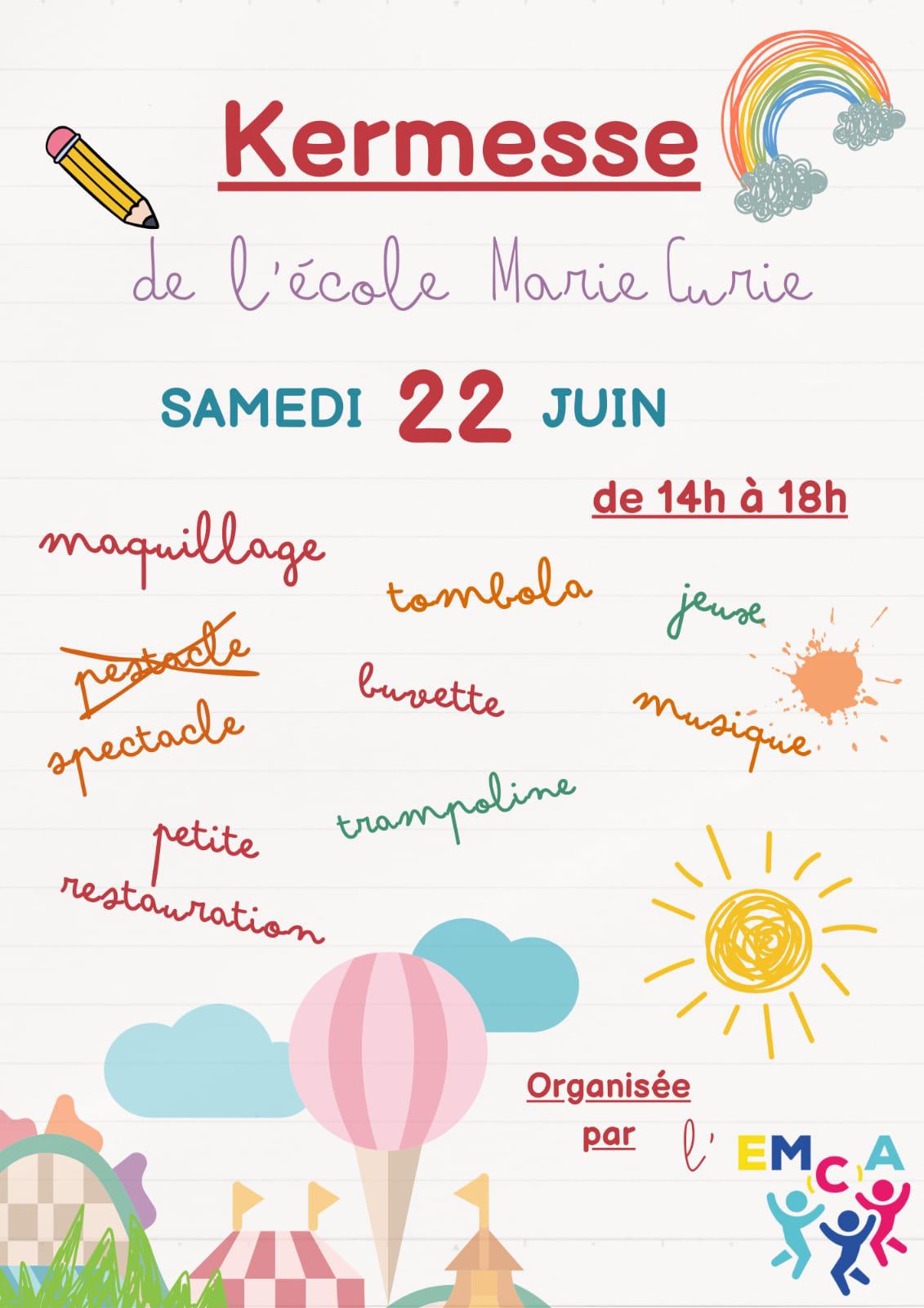 La traditionnelle kermesse de l’école Marie Curie aura lieu le 22 juin 2024 entre 14 h 00 et 18 h 00. Cet événement organisé par l’EMCA est ouvert à toutes et à tous et regroupera de nombreuses activités ainsi qu’une petite restauration…
