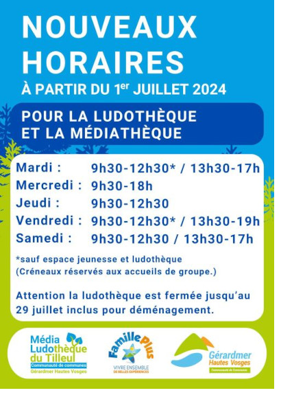 À partir du 1er juillet, La ludothèque et la médiathèque intercommunales Gérardmer Hautes Vosges se rejoignent au sein de l’Espace Tilleul avec de nouveaux horaires communs :