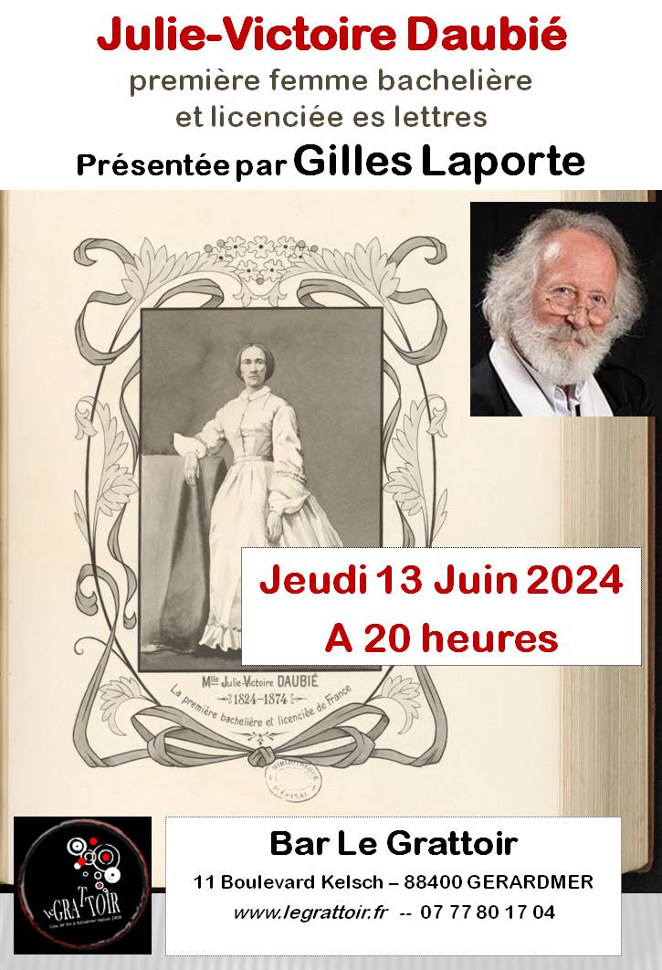La prochaine conférence au Grattoir aura lieu le Jeudi 13 juin à 20 heures. Gilles Laporte présentera Julie Victoire Daubié.