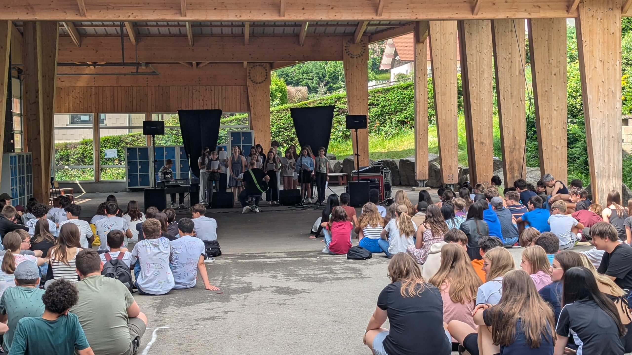 La chorale, composée en majorité d’élèves de 6e et de 3e cette année ainsi que d’un élève pianiste, s’est produite sous le préau devant leurs petits camarades du collège ainsi que de plusieurs enseignants et membres de la vie scolaire venus apprécier ce petit interlude chanté qui sentait bon la fin de l’année.