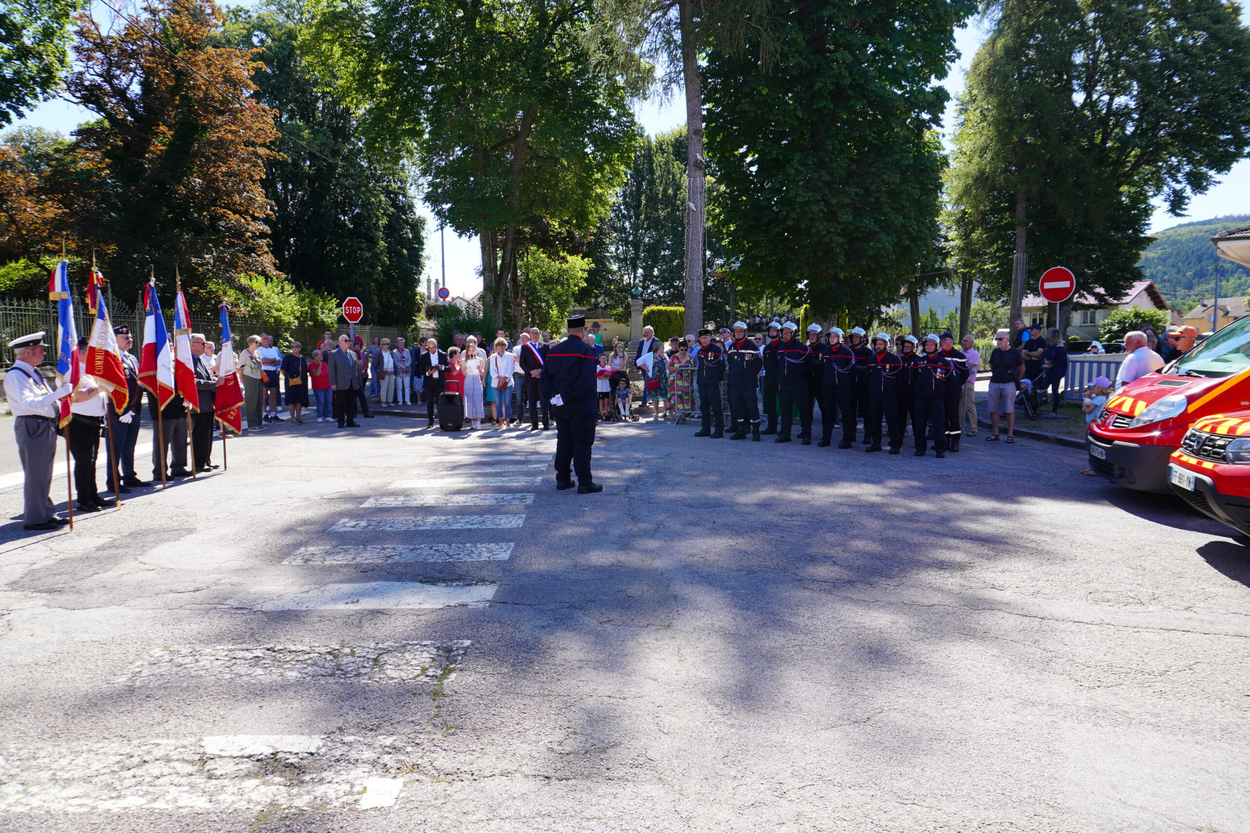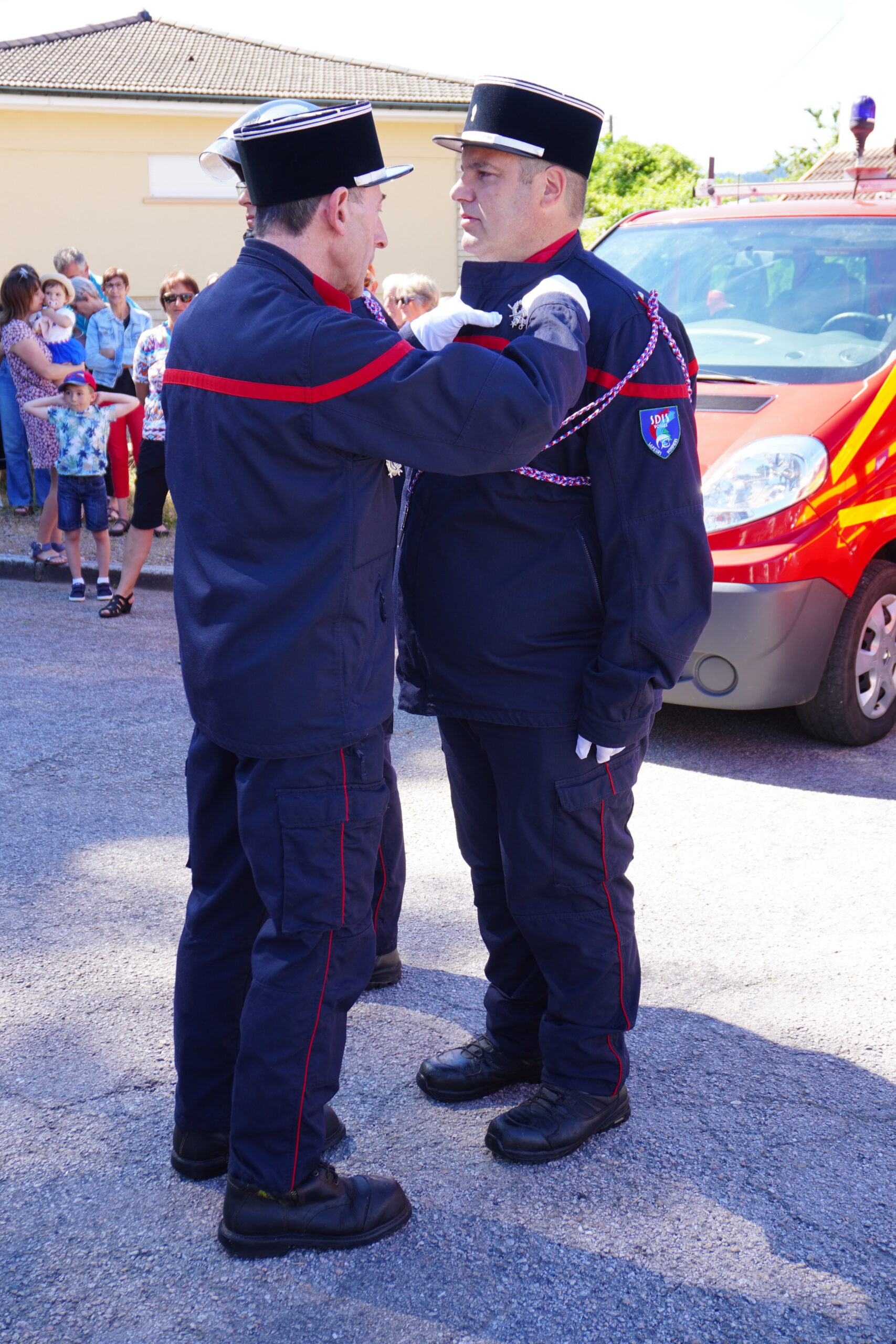 Pour la première fois, la revue a été présentée par la jeune Flavie Marchal, parente d’un pompier. Les élus ont inspecté les effectifs et les moyens matériels des pompiers de Granges-Aumontzey. Ensuite, le jeune Elerick Jacquemin, fils d’un pompier présent, a apporté les médailles aux élus pour qu’ils décorent les vestes des pompiers. Le 2ème classe Aurélien Colin a reçu la fourragère tricolore de la part d’Élisabeth Klipfel-Dott, puis la distinction de 1ère classe par Frédéric Thomas. Enfin, le lieutenant Stéphane Collin a été honoré de l’insigne de chef de centre étoile d’argent. Cette première partie de la cérémonie s’est conclue par une Marseillaise chantée a cappella par le public présent.