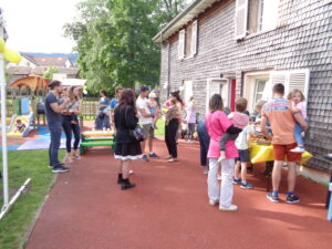 Rendez-vous était donné vendredi 05 juillet en fin d’après-midi dans le jardin de la structure, où 25 familles se sont rassemblées, sachant que toutes étaient conviées et qu’elles étaient invitées à apporter un gâteau et/ou une boisson. L’équipe avait également invité les différents partenaires (médiathèque, ludothèque, relais petite enfance ont répondu à l’appel) qui sont intervenus au cours de l’année, ainsi que l’élue à la solidarité, à la santé et à l’action sociale, Fabienne CRETEUR-CLEMENT. Cette dernière ayant prêté main forte pour servir les boissons.