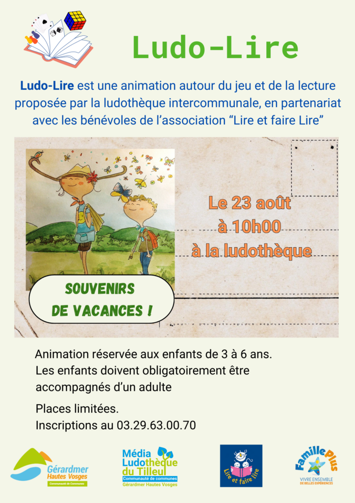 L’animation estivale « Ludo-Lire », proposée par la ludothèque se déroulera en partenariat avec l’association « Lire et Faire Lire » le 23 août 20424 à 10h00.