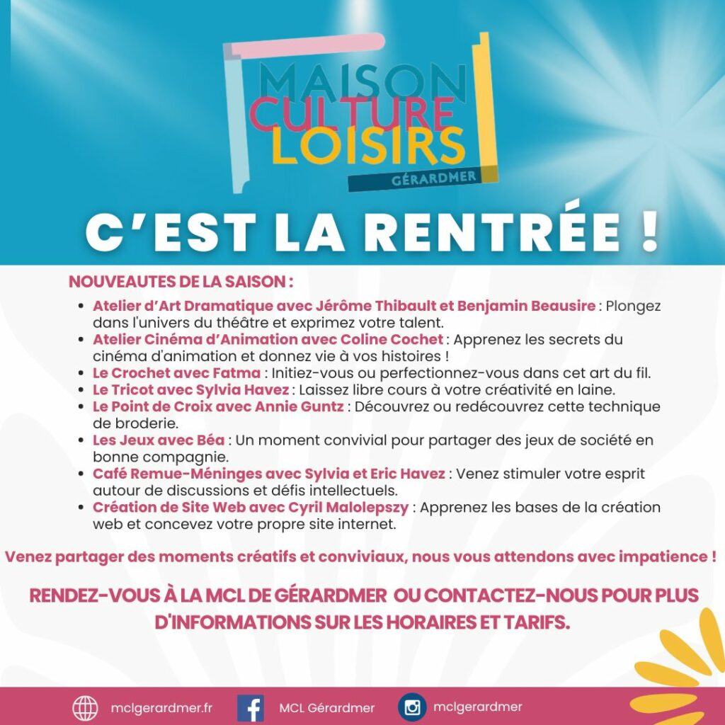 La MCL vous attende le mercredi 11 septembre pour un après-midi dédié à la présentation des activités pour la saison 2024-2025. Un moment convivial avec les animateurs ouvert à tous de 14 h 00 à 17 h 00, avec petites douceurs et rafraichissements qui vous seront proposés.