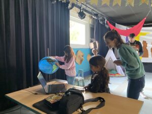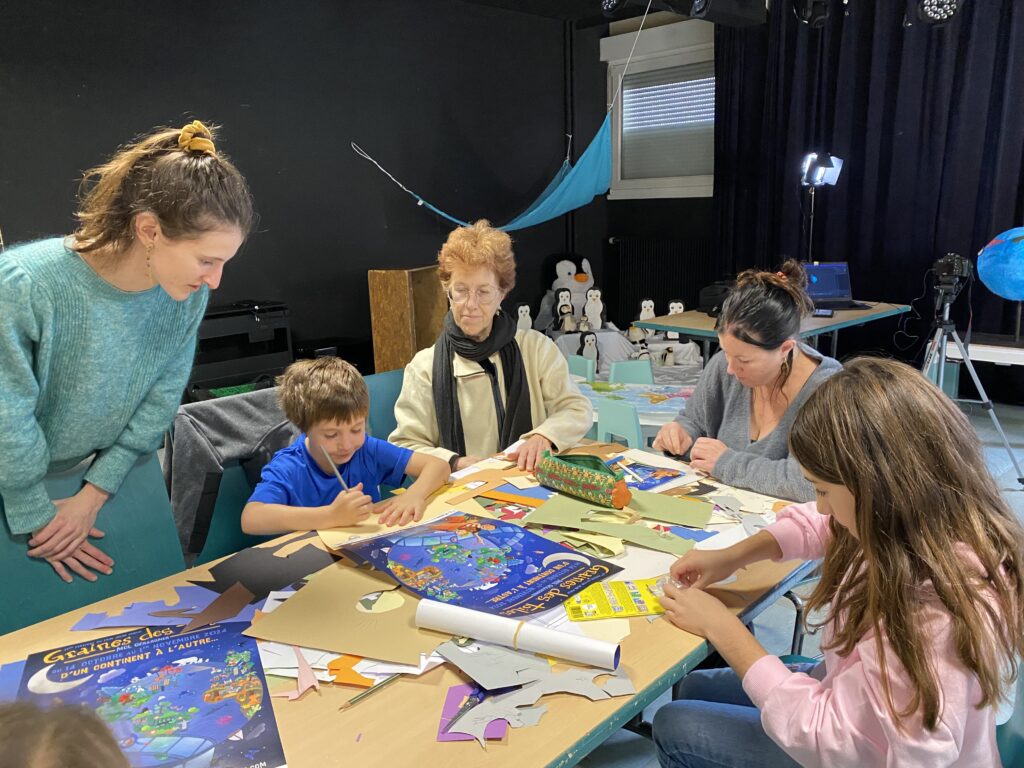 Il s’agissait de découvrir les techniques traditionnelles du cinéma d’animation, image par image, avec des maquettes ou du papier découpé. Un groupe travaillait autour de la maquette d’un globe terrestre à l’aide d’un logiciel relié à un appareil photo qui prenait des clichés de chaque déplacement du globe et permettait de voir le mouvement à l’écran. « Un dessin animé professionnel utilise 24 images par seconde » expliquait Coline Cochet, en général elle réalise sur ses ateliers du 12 images par seconde. Elle a ensuite proposé aux enfants de découper des petits personnages à ajouter sur le globe. Un autre groupe a travaillé à l’aide de papier découpé, créant une marionnette et lui donnant vie sous le flash d’une tablette par d’infimes mouvements. Ces techniques reliées au numérique permettaient aux enfants de visualiser aussitôt le film d’animation qu’ils avaient créé. Tandis qu’à la table de dessin et découpage parents, grands parents et enfants ont pu développer leur créativité et imaginer des histoires qu’ils allaient pouvoir animer à leur tour.