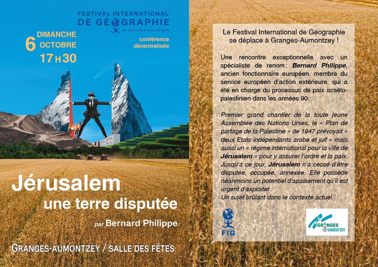 – samedi 5 octobre, 17 h, à Remiremont, Grand Salon de l’Hôtel de Ville, avec Bernard Philippe, sur le thème « Jérusalem, une terre disputée ». Bernard Philippe est un ancien fonctionnaire européen, membre du service européen d’action extérieure, en charge du processus de paix israélo-palestinien.