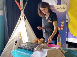 Un bel engouement pour ce 1er brunch organisé durant le festival et les inscriptions ont dû être arrêtées à 40 personnes. Du sucré et du salé au menu avec des plats en provenance des 4 coins du globe. Pancakes, beurre de cacahuètes, bacon et œufs brouillés pour l’Amérique du nord. Fruits exotiques pour les îles. En plat chaud il y avait un Dahl de lentilles et du riz au poulet biryani typiquement indien ou encore un chili con carne tout droit sorti d’Amérique du sud. Le tour du monde se poursuivait avec des nems, grande spécialité d’Asie et des Falafels orientales. L’Europe était présente aussi avec ses fromages, charcuteries et viennoiseries. Des céréales et divers produits laitiers complétaient le buffet pour un petit déjeuner continental.