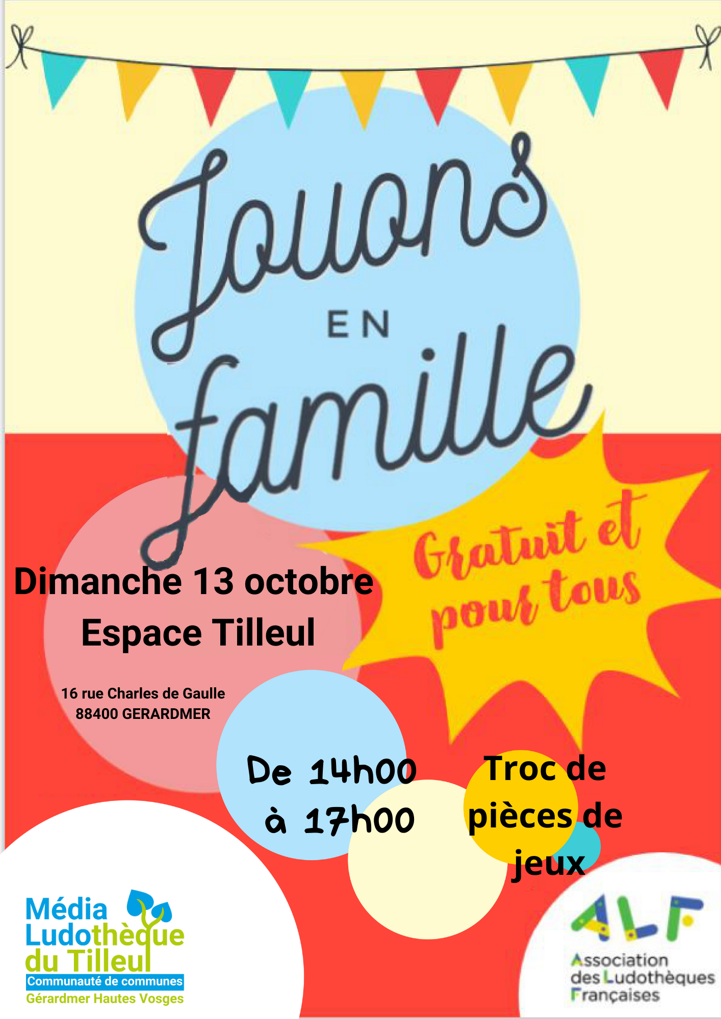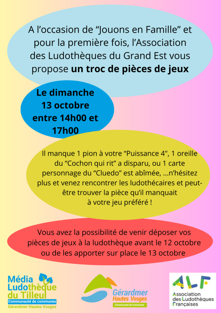L’Association des Ludothèques Françaises Grand Est vous invite à une après-midi ludique le dimanche 13 octobre, à l’Espace Tilleul, à partir de 14 h 00.
