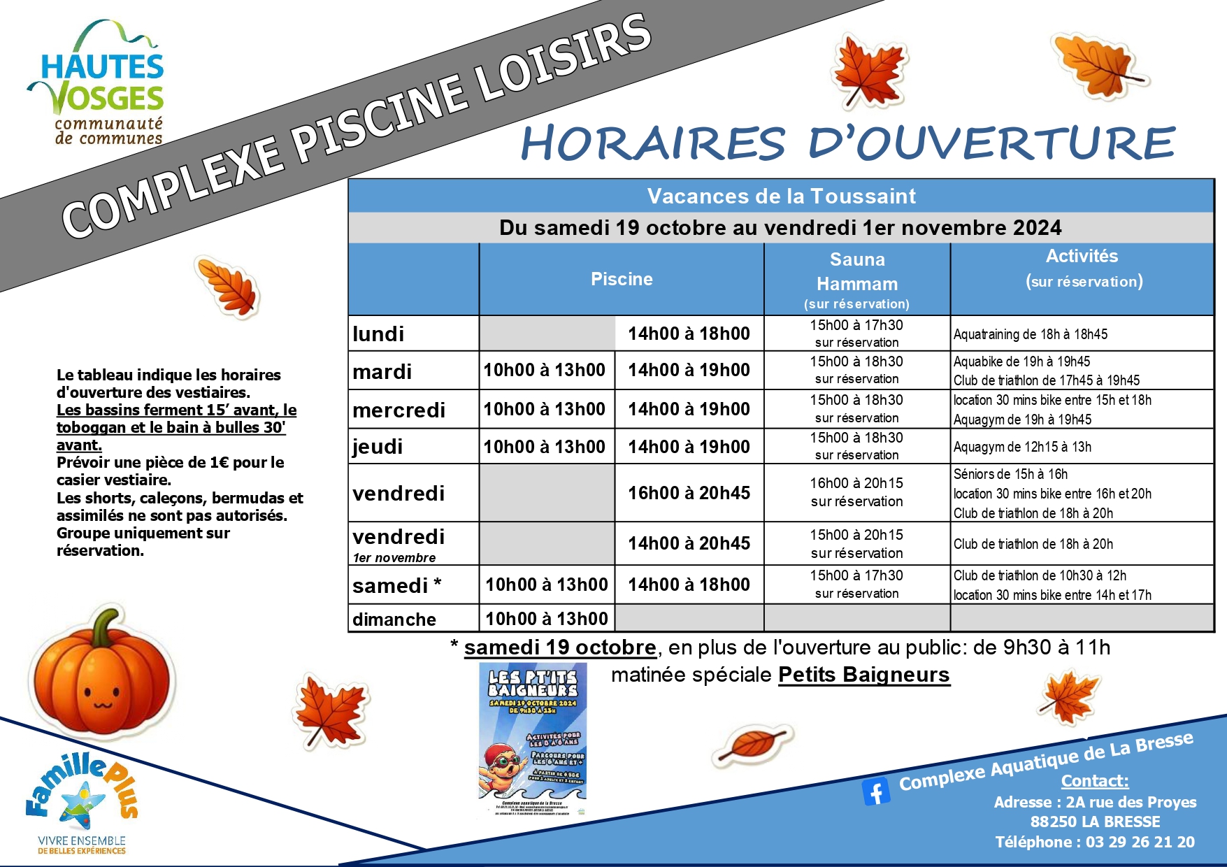 Les horaires d’ouverture de la piscine de La Bresse pour les vacances de la Toussaint sont à retrouver ci-dessous. À noter que le 1 novembre, la piscine sera ouverte de 14 h à 20 h 45.