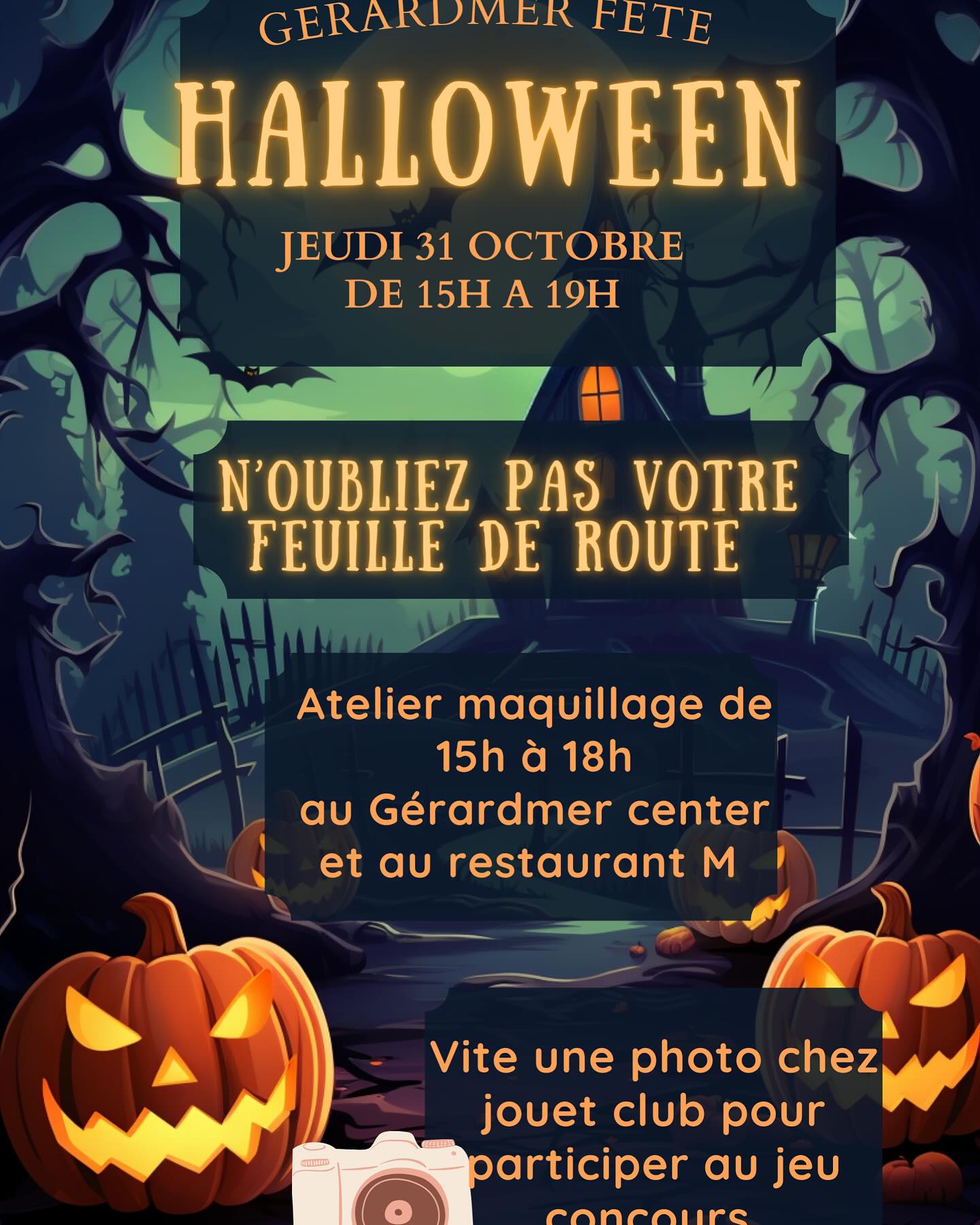 Une trentaine de commerçants participent à l’opération proposée par Gérardmer Animation qui vous a notamment préparé un petit jeu de piste à travers le centre ville. Une feuille de route à remplir pour remporter des lots sera remise aux enfants pour les aider à trouver les citrouilles et donc les commerces participants. Petits et grands, vous êtes donc invités à vous déguiser et même à vous faire maquiller avant de partir dans les rues en quette de sucreries et de frissons. Pour vous faire maquiller gratuitement, rendez-vous de 15 h 00 à 18 h 00 au magasin Bazar Biz’art de la galerie marchande, soit au M, Bistrot de Montagne de la place Albert-Ferry ( @bizartbazar ou @lembistrotmontagne ). Un atelier à selfie vous attendra également au magasin JouéClub de Gérardmer afin d’immortaliser cette soirée mais aussi de participer à l’opération Octobre Rose. E effet, un euros par photo sera reversé à la Ligue Contre le Cancer.