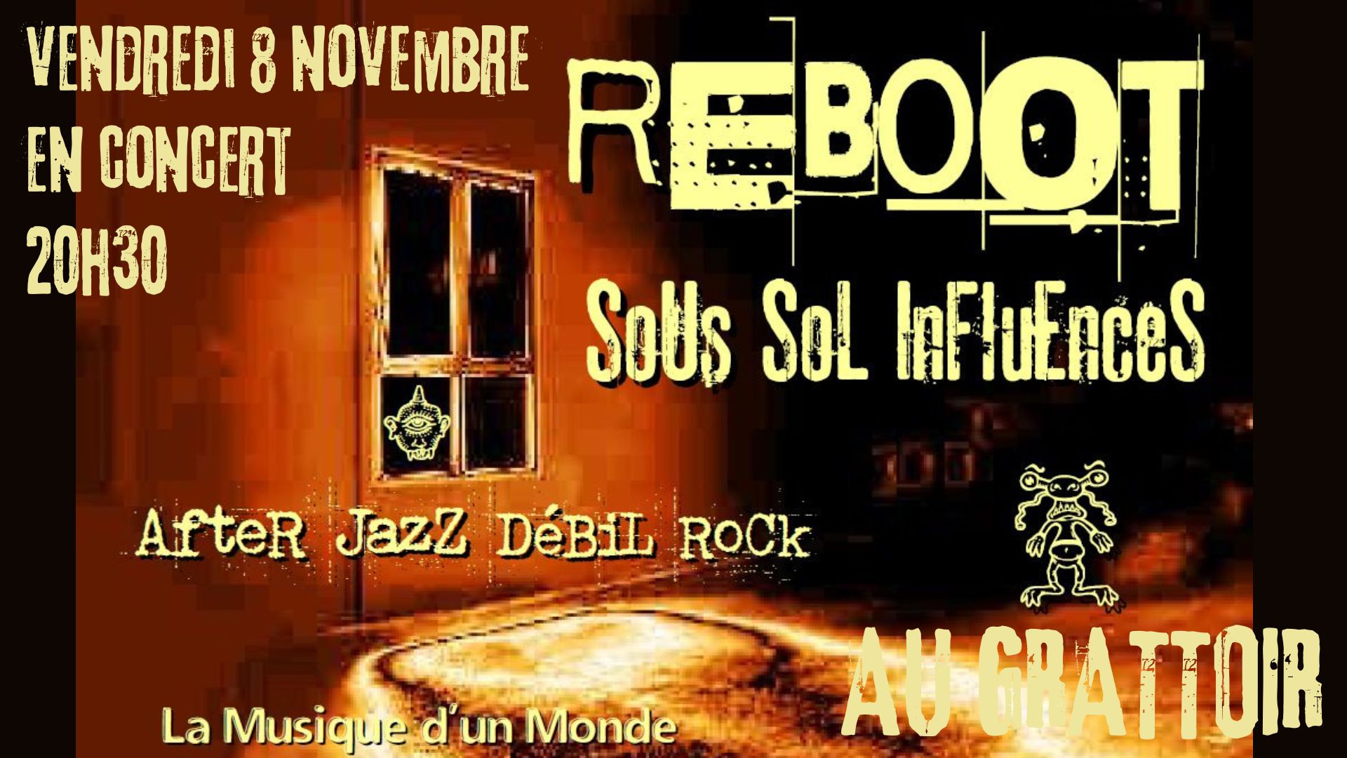 A l’origine, composé d’un saxophoniste qui donne parfois de la voix et d’un bassiste, Reboot propose des compositions originales. Leur musique de sous-sol aux diverses influences est composée d’univers changeants, fluctuants et très souvent énergiques, et ce définit comme de « l’after jazz débil rock ».