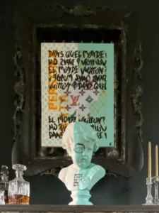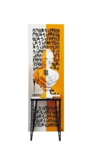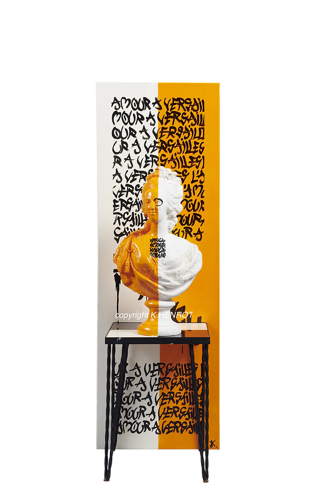 La dernière série en date, Persona*, est plus qu’une évolution, c’est une révolution. Folle, ludique, inspirée du Street Art, joyeuse et colorée. KHB libérée de ces liens mord la vie à pleines dents, ne s’interdisant aucune digression pour démasquer l’hypocrisie, les injustices, se jouant de la divine comédie Humaine. Boîtes aux lettres vintage, jerricans vintage, collages sur toiles de statues mêlant mythologie Gréco-Romaine et lois bibliques, chambardement Rock’n’Roll des statues des siècles passés, le triste sort de Louis XII, les stars… ça fuse et ça fusionne dans tous les sens !