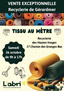 L’association L’Abri est ravie d’annoncer une vente exceptionnelle de tissu au mètre qui se tiendra le samedi 26 octobre de 9h à 17h, dans la recyclerie des Hautes-Vosges de Gérardmer. Une belle occasion pour tous les passionnés de couture qui souhaitent trouver de nouveaux tissus ou accessoires à petits prix et ainsi laisser libre cours à leur créativité…