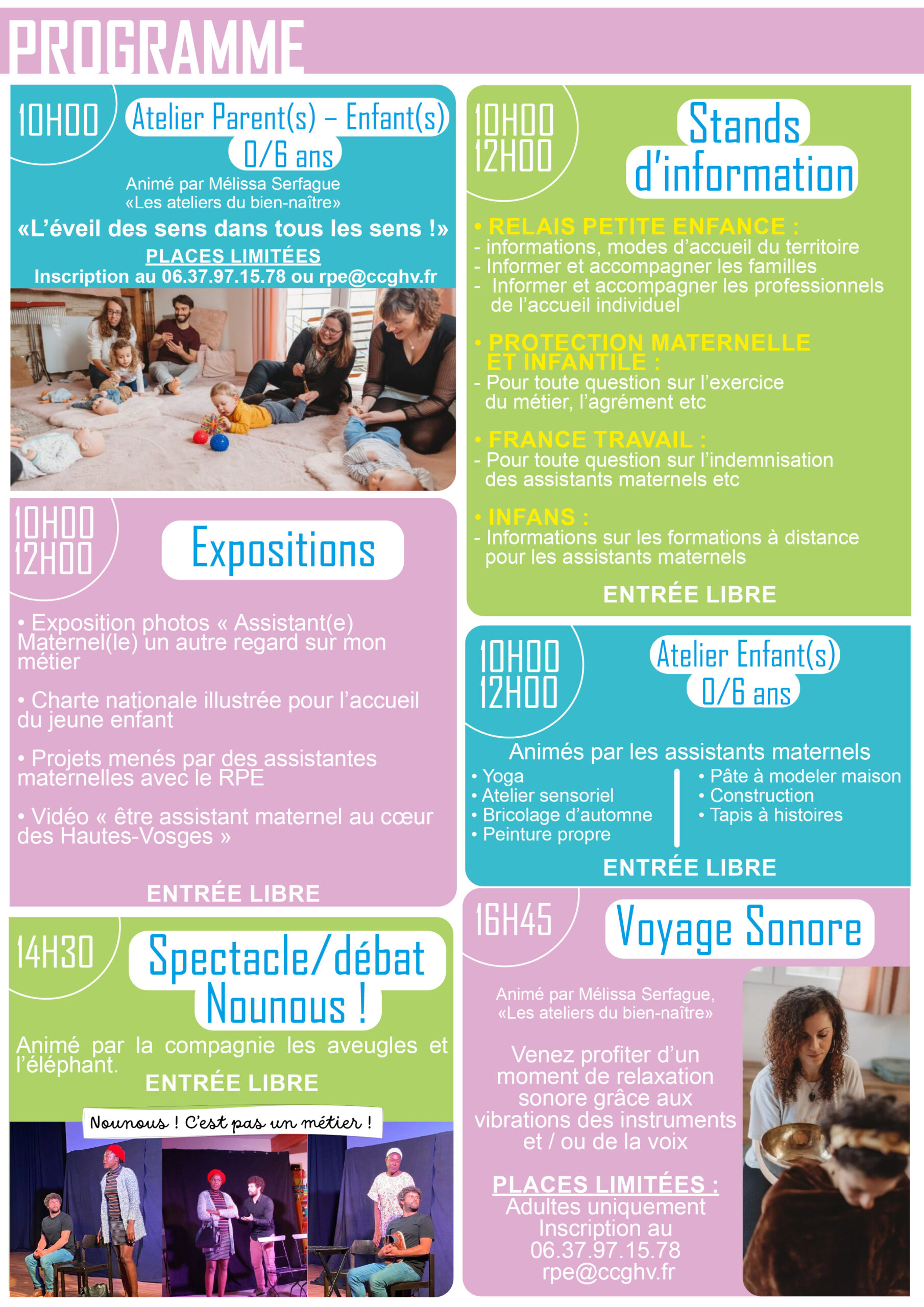 Vous retrouverez aussi toute la matinée des ateliers pour les enfants de 0 à 6 ans animés par des assistantes maternelles. Ces ateliers seront en accès libre et sans inscription entre 10h et 12h.