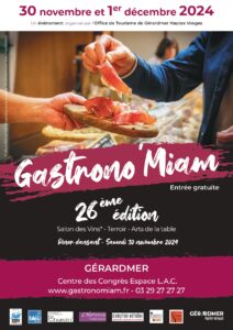Les 30 novembre et 1er décembre prochains, le centre des congrès Espace L.A.C de Gérardmer se transforme en un véritable temple de la gastronomie et du savoir-faire local. L’Office de Tourisme de Gérardmer Hautes-Vosges a le plaisir de vous inviter à son événement phare de décembre, le salon Gastrono’Miam, où les plaisirs de la table sont à l’honneur. Que vous soyez un fin gourmet ou simplement à la recherche d’une sortie conviviale en famille ou entre amis, cet événement est fait pour vous !