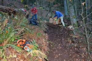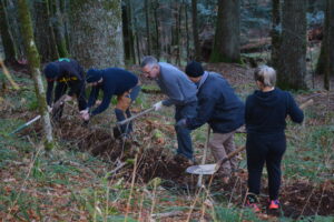 Un sentier très fréquenté qui présentait une zone à risque d’où un travail conséquent pour sécuriser cet itinéraire marqué triangle rouge. Dès 9 h 00 du matin une vingtaine de personnes réparties en plusieurs équipes munies de pelles, pioches, tronçonneuse sont mobilisées pour tracer cette nouvelle portion qui avait été préalablement bornée par Dominique Gegout, responsable du secteur pour le Club Vosgien. Le tout nouveau sentier permet de contourner l’ancienne partie raide et dangereuse, désormais fermée.