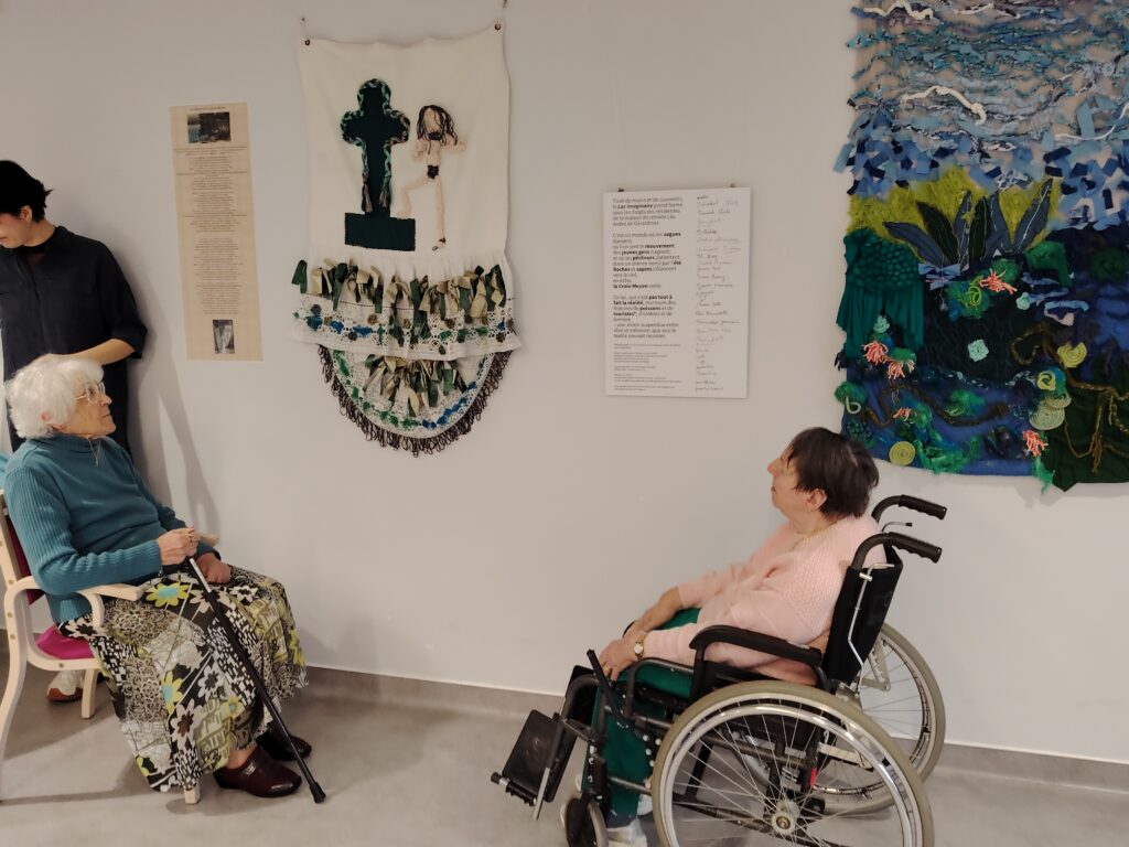Jeune diplômée de l’école d’arts d’Épinal, Jeanne Mentrel a donc travaillé avec une quinzaine de résidents, à raison d’une fois par semaine pendant deux mois, sur un projet artistique axé notamment sur le textile. Après une première phase destinée à récolter de la laine et du carton ainsi qu’à trouver le thème de leur future œuvre qui fut baptisée Le Lac Imaginaire, les résidentes sont entrées dans le vif du sujet avec la confection de nœuds et l’utilisation de différentes techniques telles que la broderie, le tricot, le crochet ou la couture. Chaque participante a vu se réveiller en elle une pratique de prédilection. Un peu comme le vélo, ça ne s’oublie pas et ça revient vite avec la pratique !