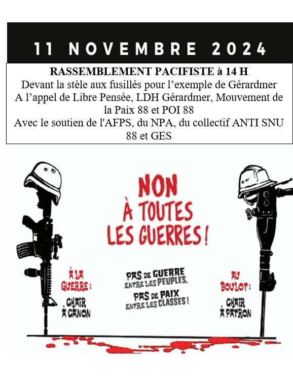 La Libre Pensée organise avec la LDH Gérardmer et le Mouvement de la Paix du 88 un rassemblement pacifiste le 11 novembre devant la stèle aux fusillés pour l’exemple de Gérardmer à 14h.