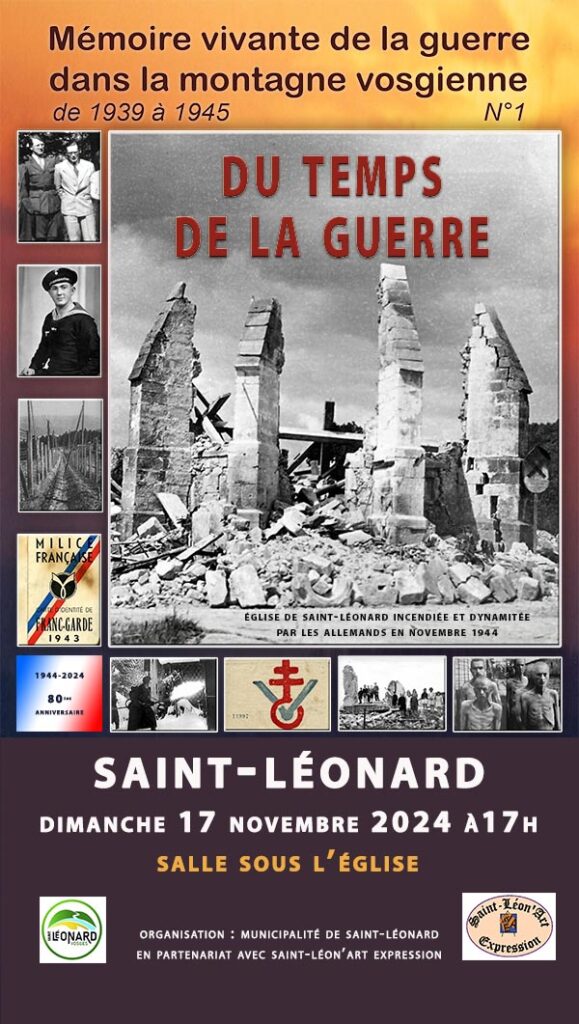A l’invitation de la municipalité de Saint-Léonard, en partenariat avec Saint-Léon’Art Expression, Jacques Cuny présentera son film « Du temps de la guerre » sous l’église de Saint-Léonard, ce dimanche 17 novembre à 17 heures. Entrée libre.