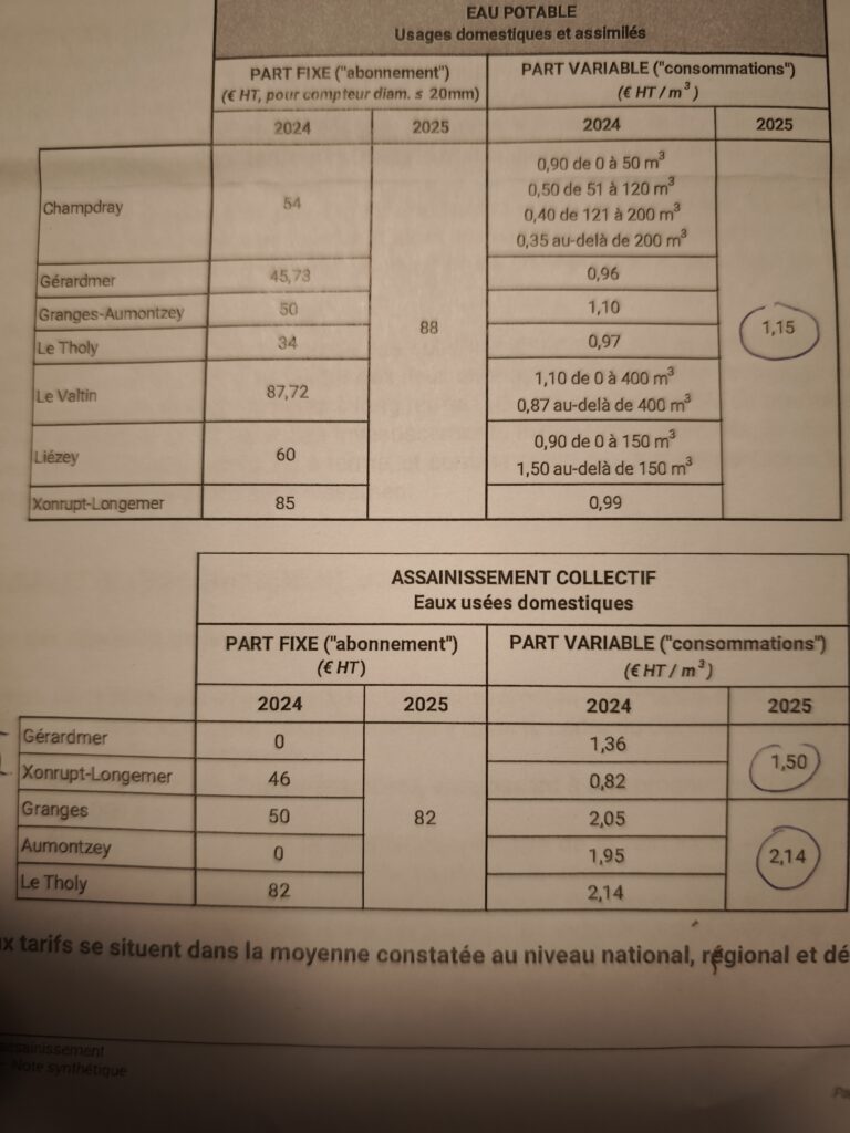 Ajoutons enfin que la marche vers l’harmonisation des tarifs sur l’ensemble du territoire se poursuit avec, pour 2025, un prix unique proposé pour l’eau potable et 2 tarifs pour l’assainissement, Gérardmer et Xonrupt étant connectées à la même unité et les autres communes à une autre unité de traitement.